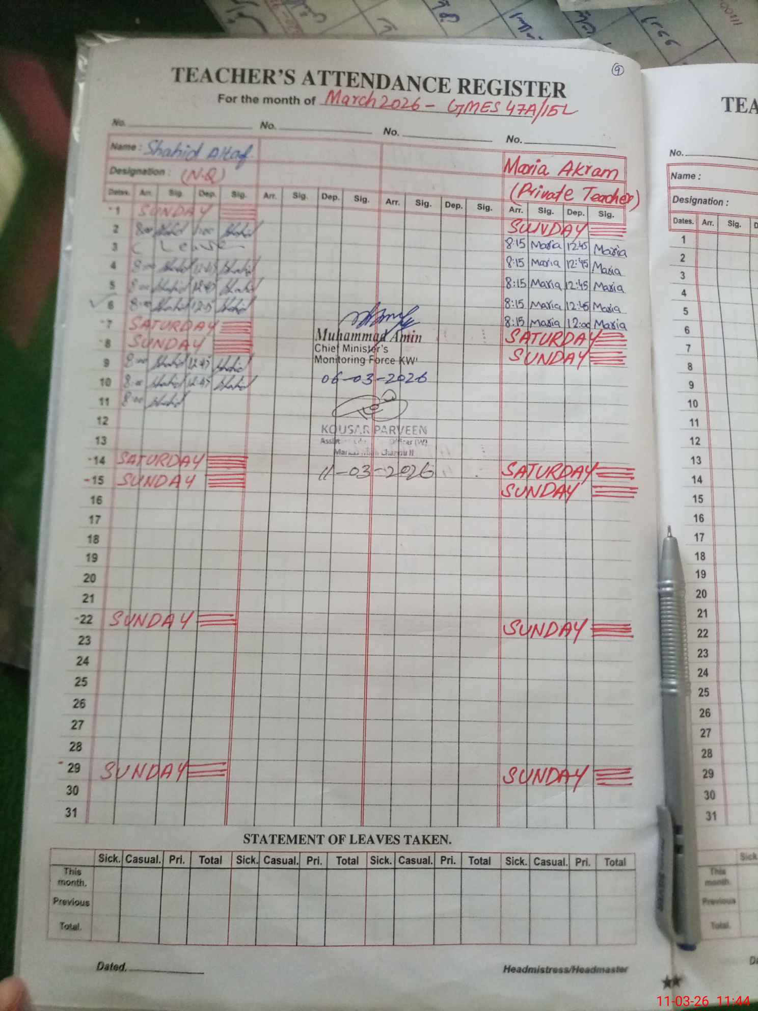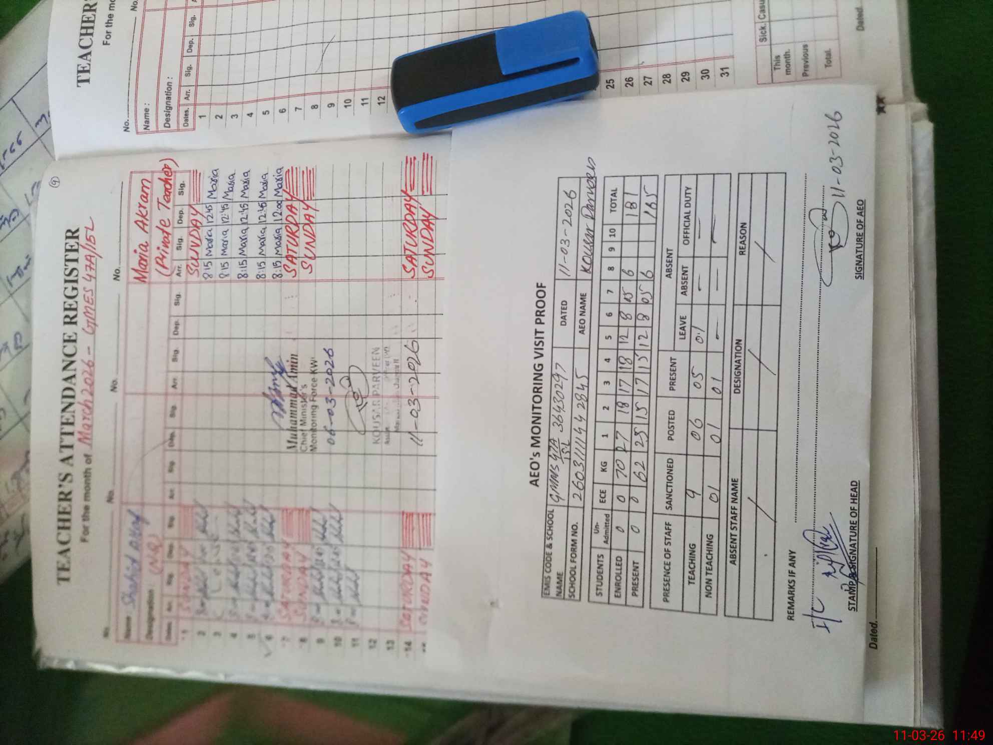 | Attendance Register | Head Teacher | MEA with School | Visit Proof |