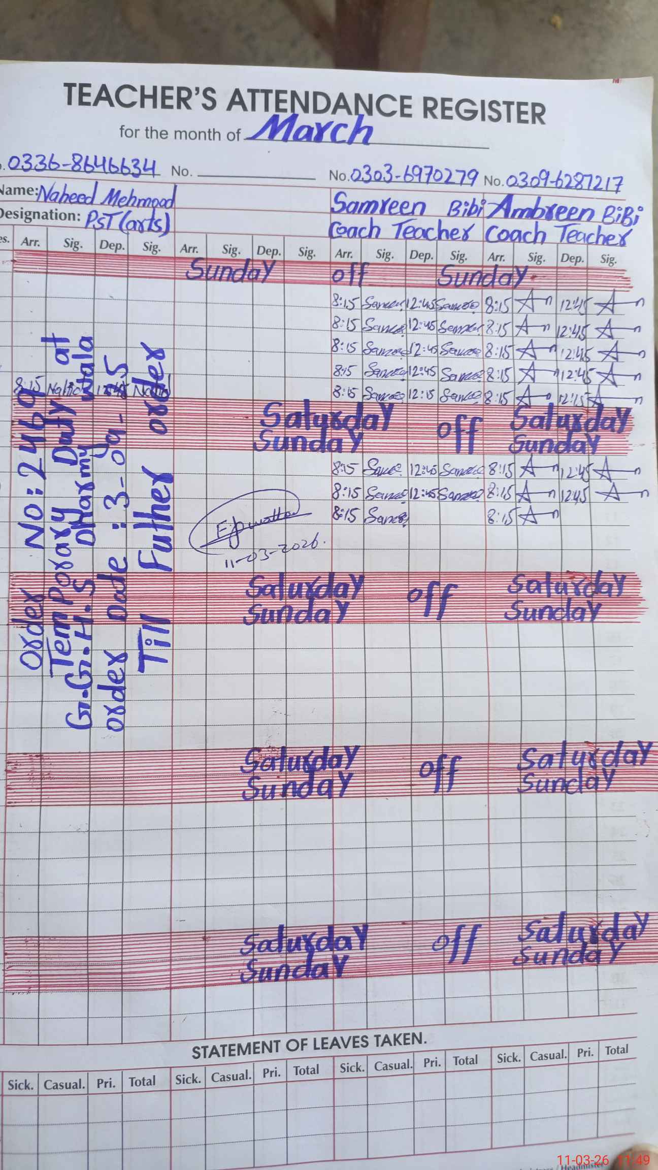 | Name: NA**** ME**** Designation: (School Headmaster's/Headmistress's) PST Phone/Cell Number: 03**** |