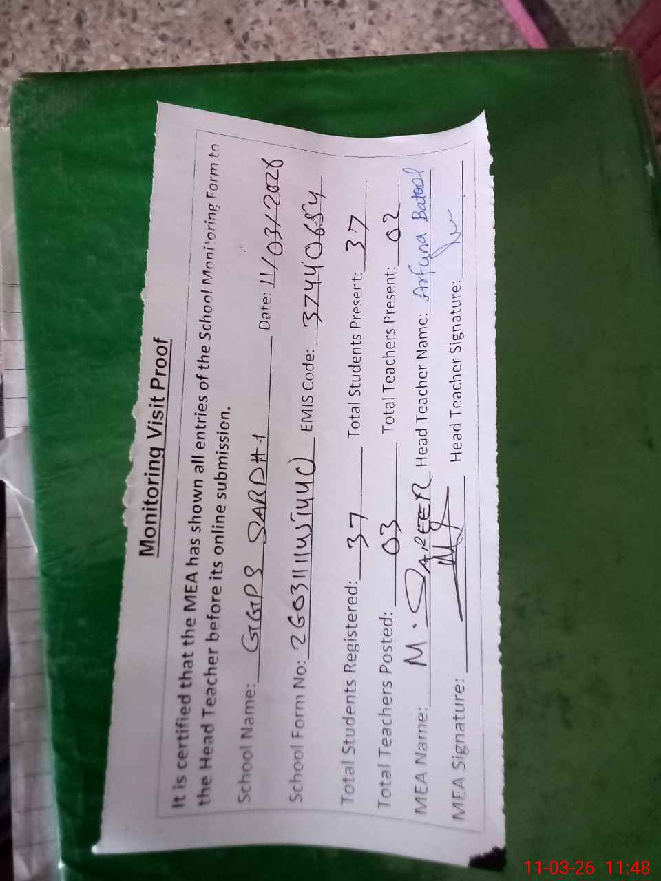 | Attendance Register | Head Teacher | MEA with School | Visit Proof |