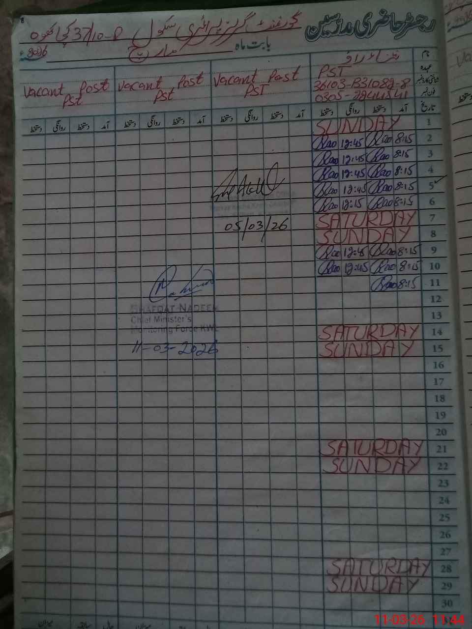 | Name: Sa**** Ra**** Designation: (School Headmaster's/Headmistress's) PST Phone/Cell Number: 03**** |
