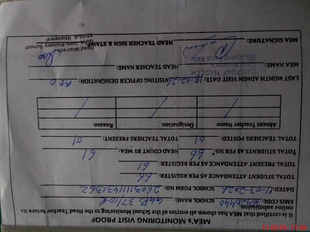 | Attendance Register | Head Teacher | MEA with School | Visit Proof |