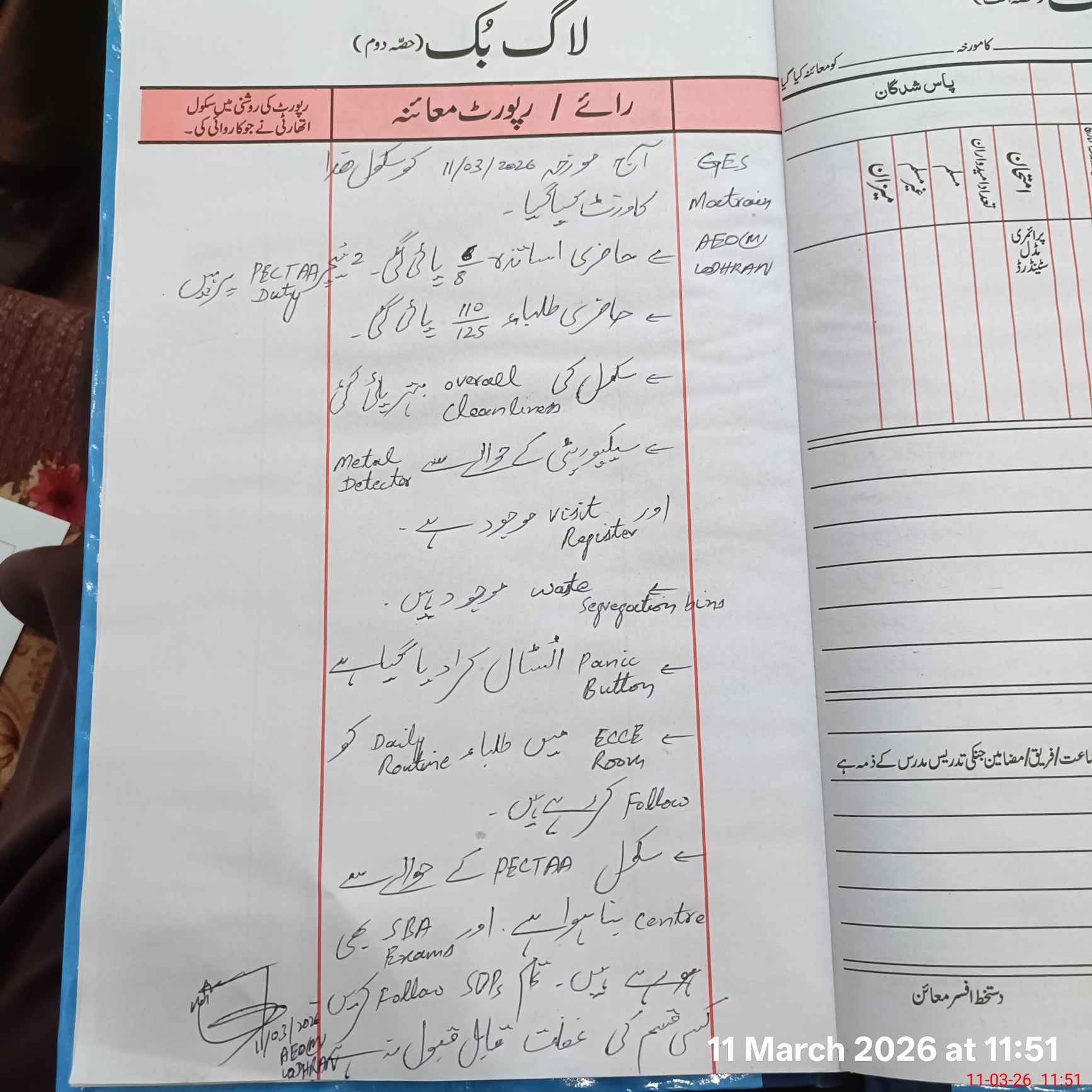 | Certified that this School was Inspected by the Undersigned MEA/DMO Today and the Information Stated Above is as Per Record. | |||||