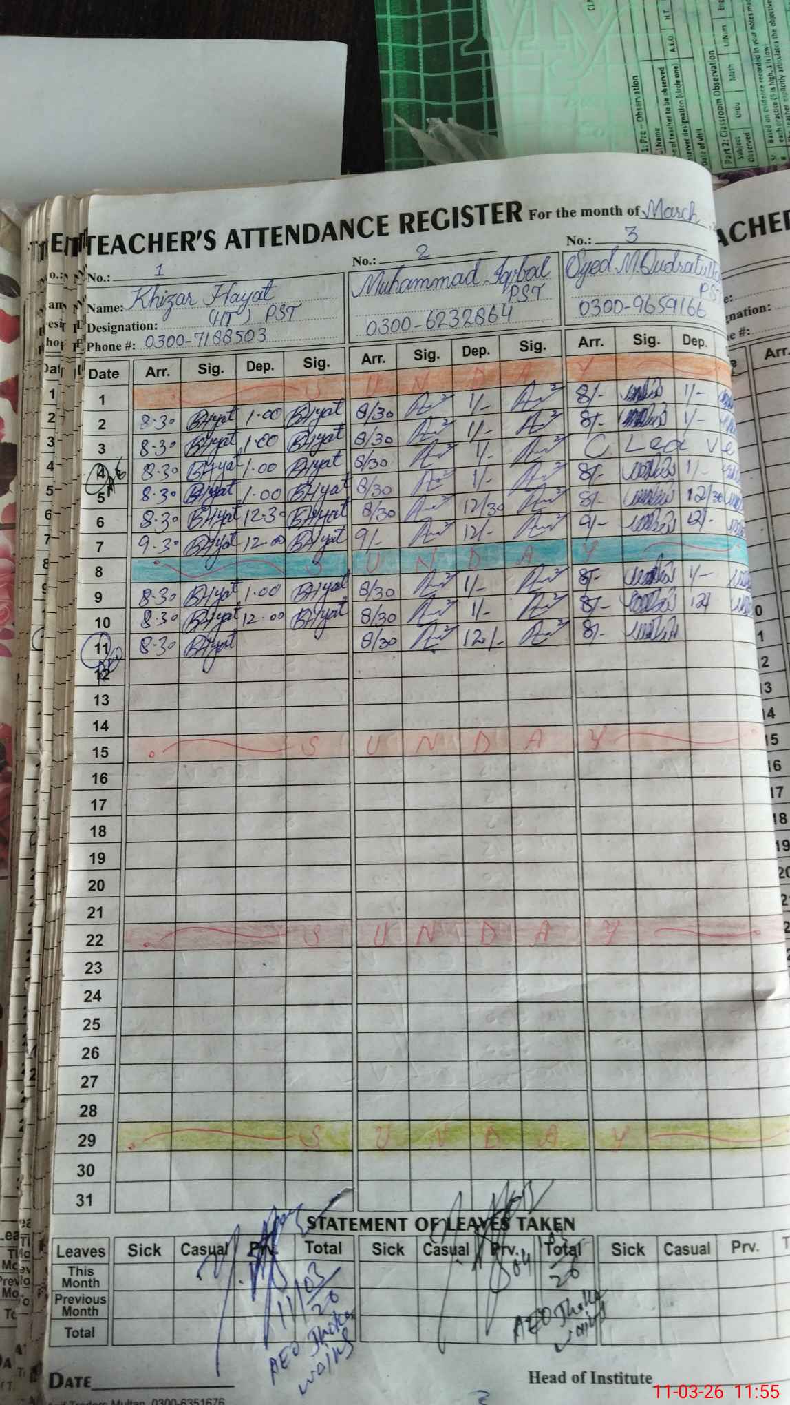 | Name: KH**** HA**** Designation: (School Headmaster's/Headmistress's) INCHARGE Phone/Cell Number: 03**** |