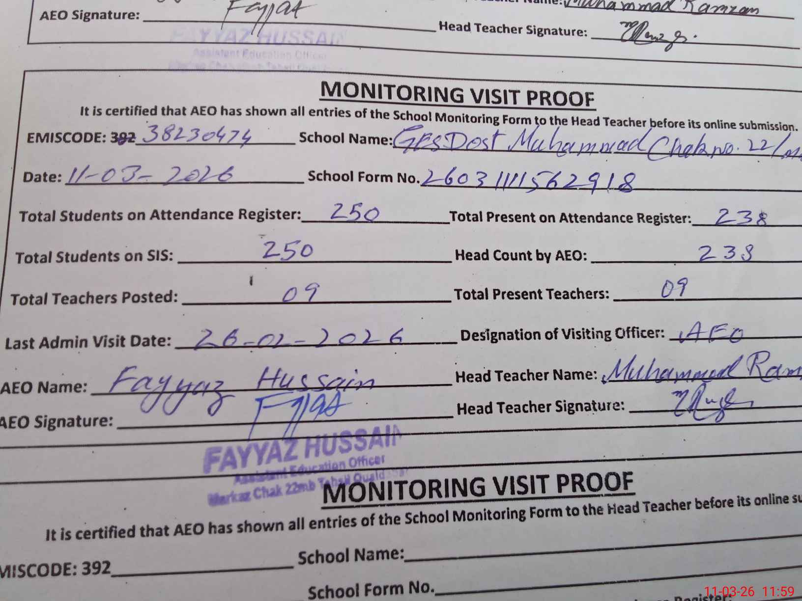 | Attendance Register | Head Teacher | MEA with School | Visit Proof |