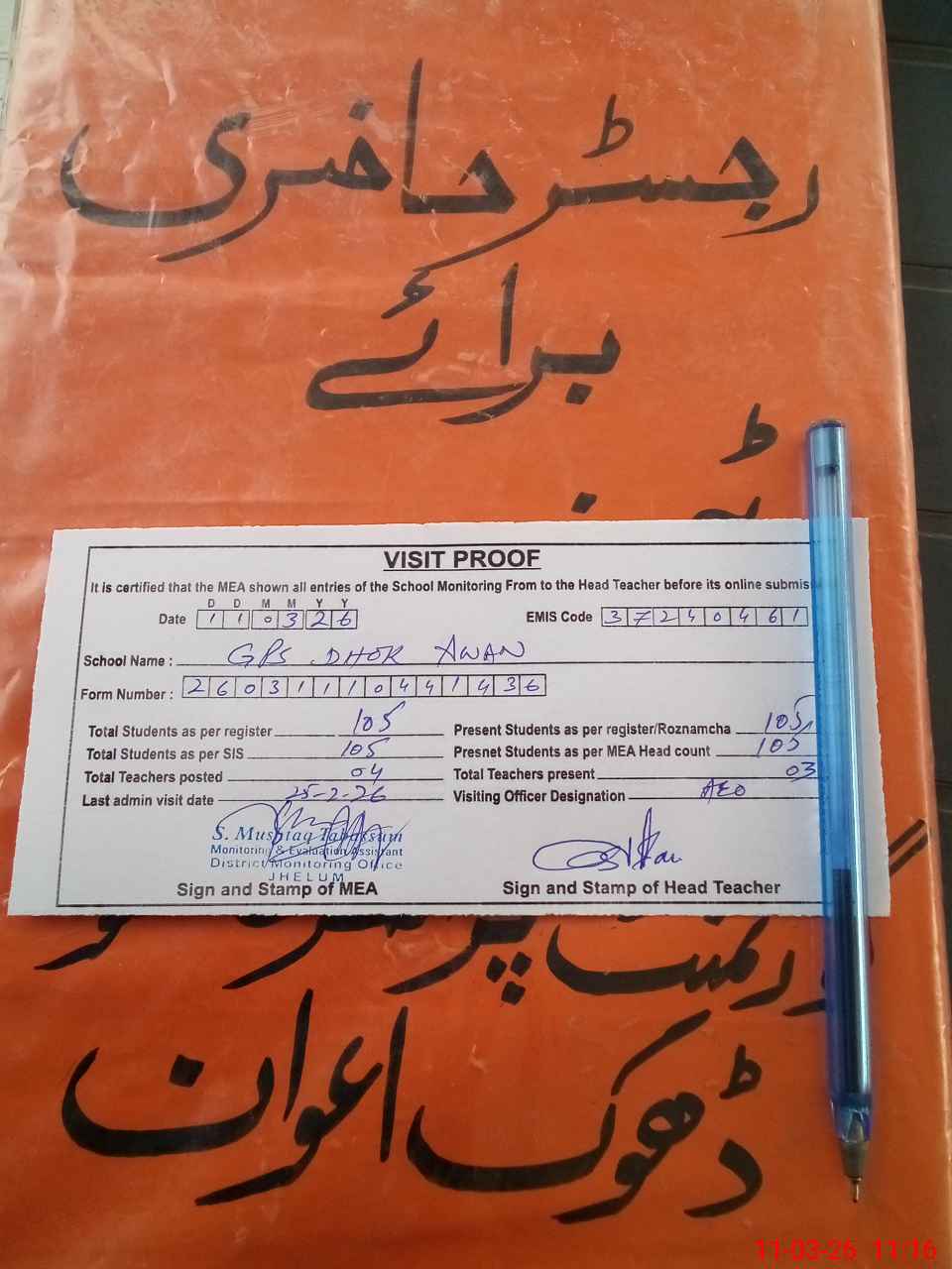 | Attendance Register | Head Teacher | MEA with School | Visit Proof |