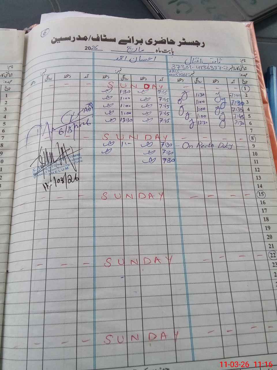 | Remarks (Use Separate Page if Required): HT Saqib Iqbal is on Exam duty. NSB and FTF updated record not available. | |||||