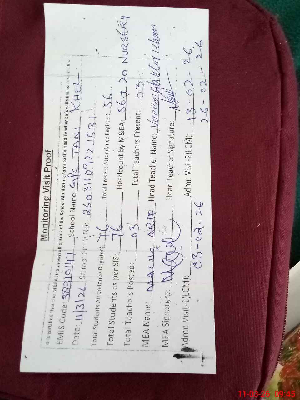 | Attendance Register | Head Teacher | MEA with School | Visit Proof |