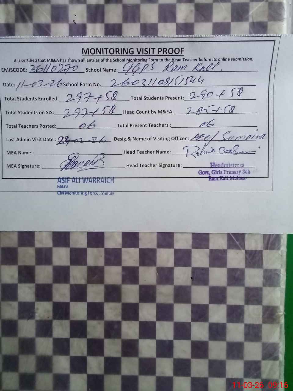 | Attendance Register | Head Teacher | MEA with School | Visit Proof |