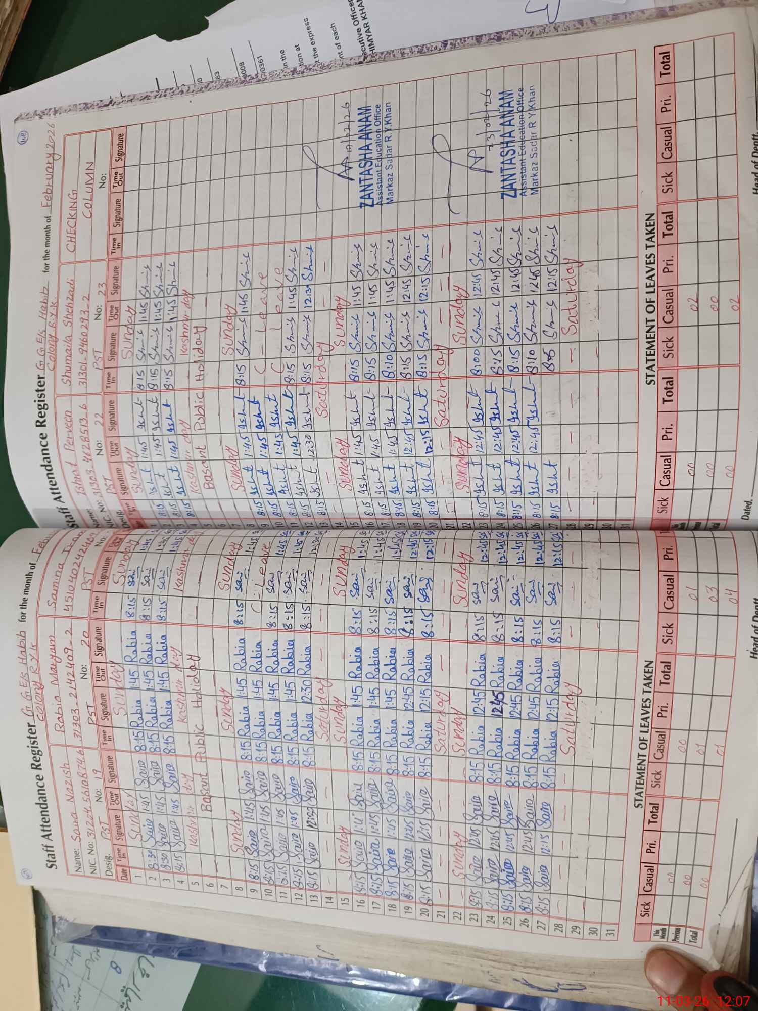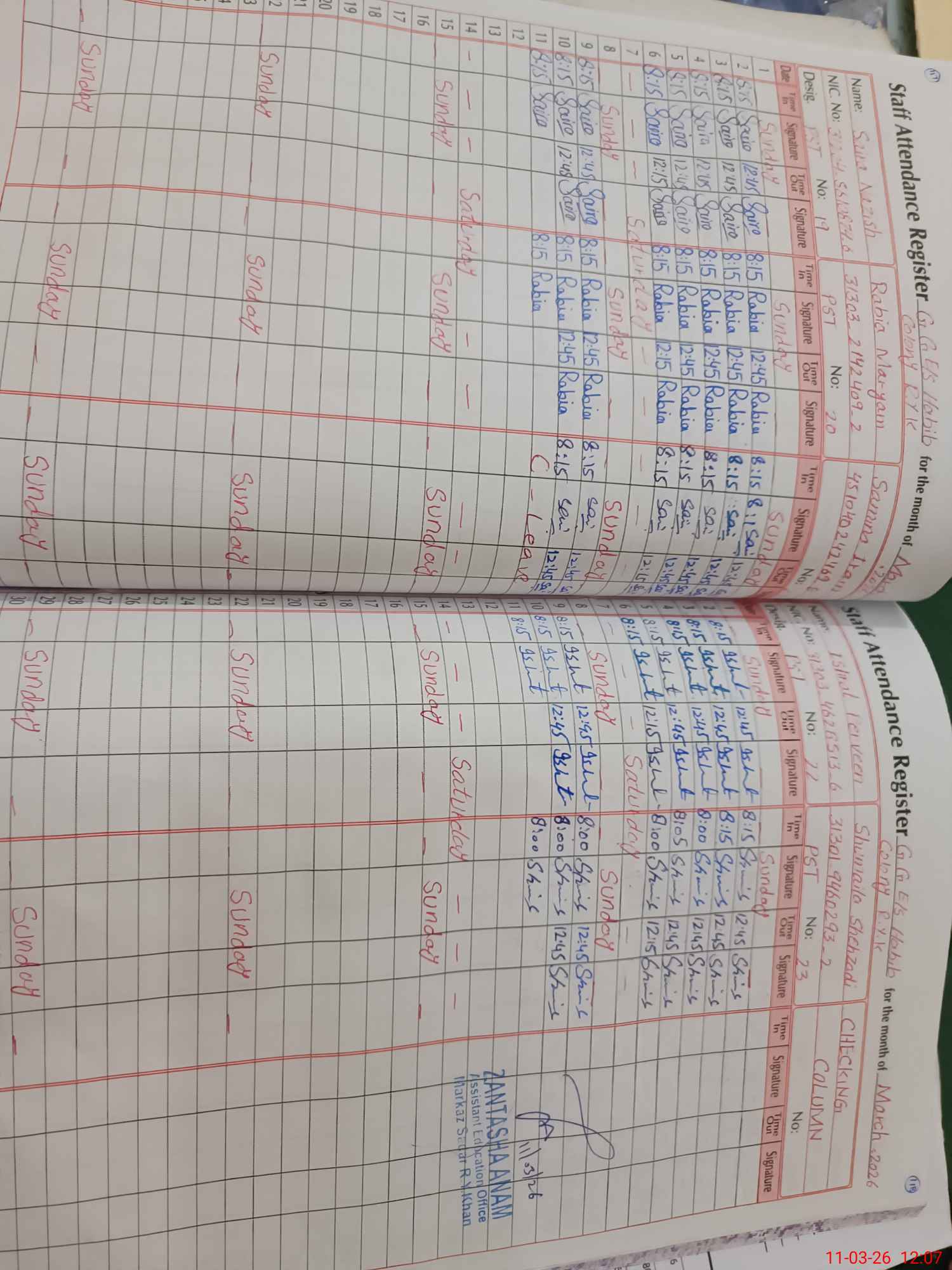 | CNIC | Full Name | Designation | R/C | Absence During Last Calender Month |