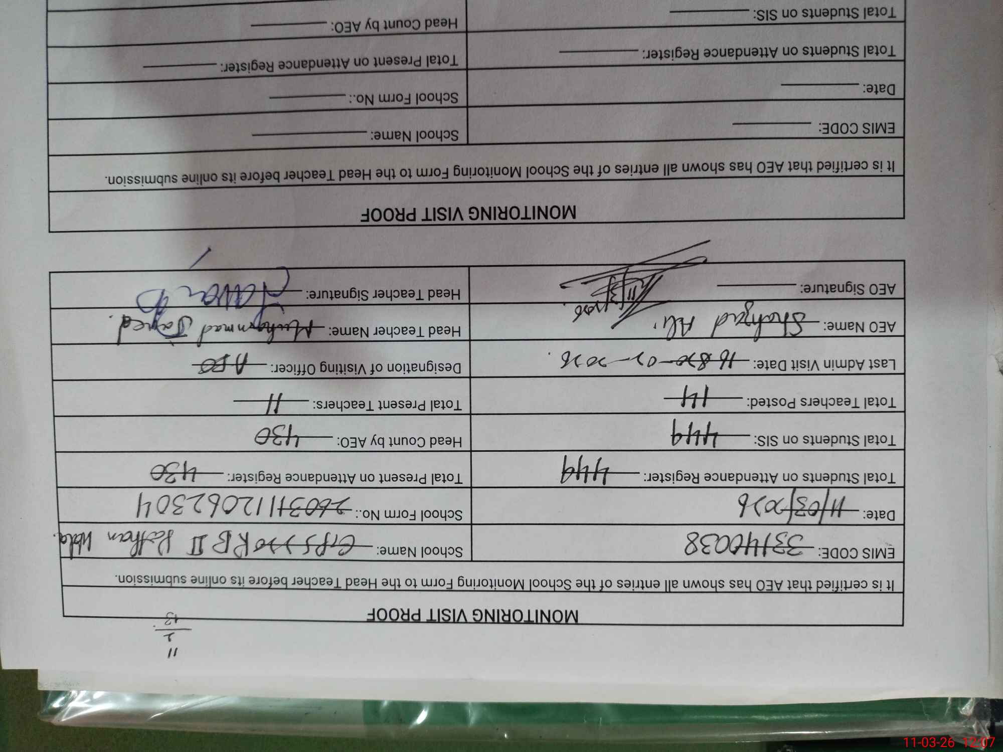 | Attendance Register | Head Teacher | MEA with School | Visit Proof |