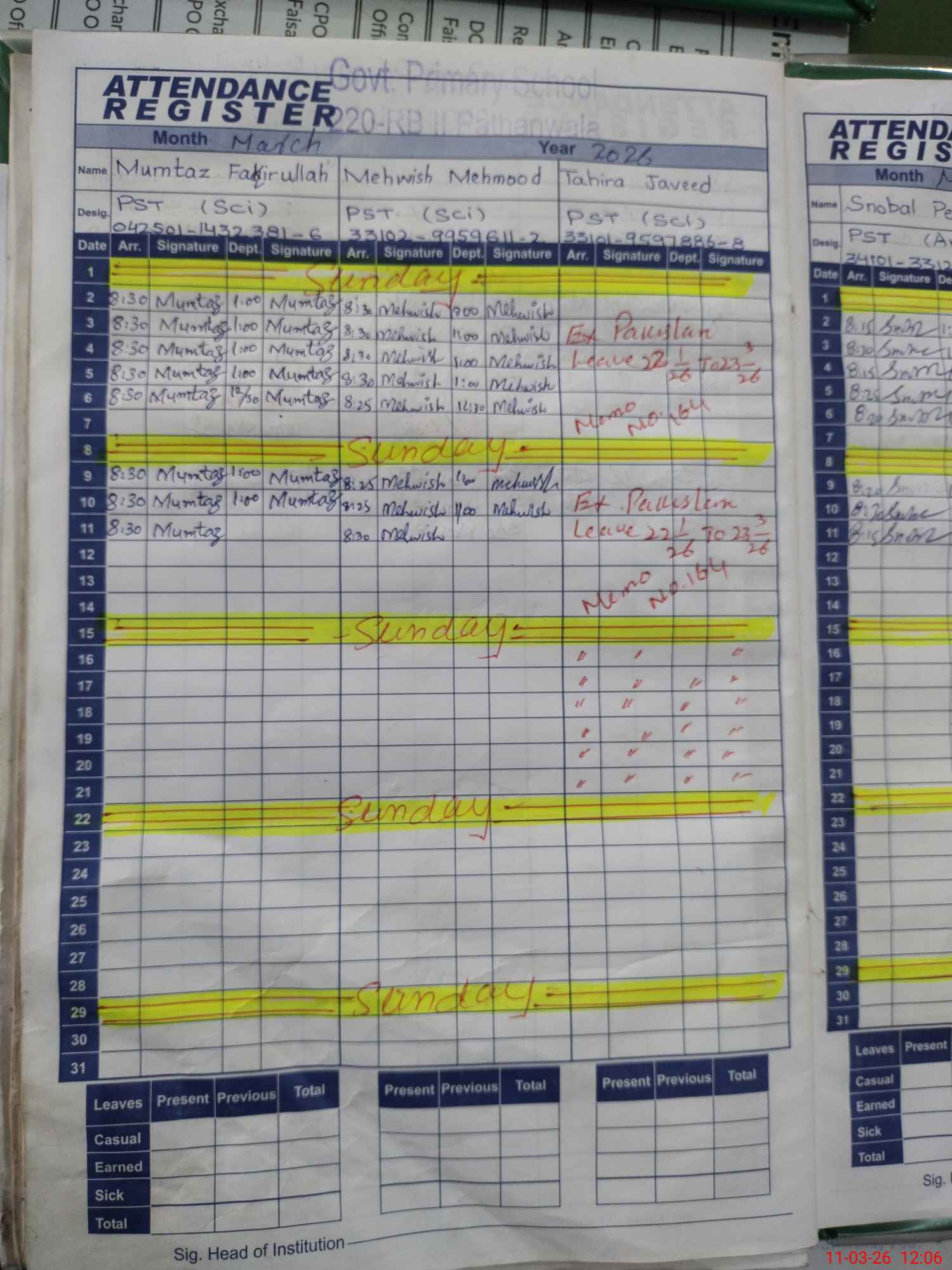 | 33**** | Mu**** No**** Sh**** | PST Arts | Regular | 0 | 0 | 0 | 0 | 0 | 0 | 0 | 0 | 0 | Exam Duty |