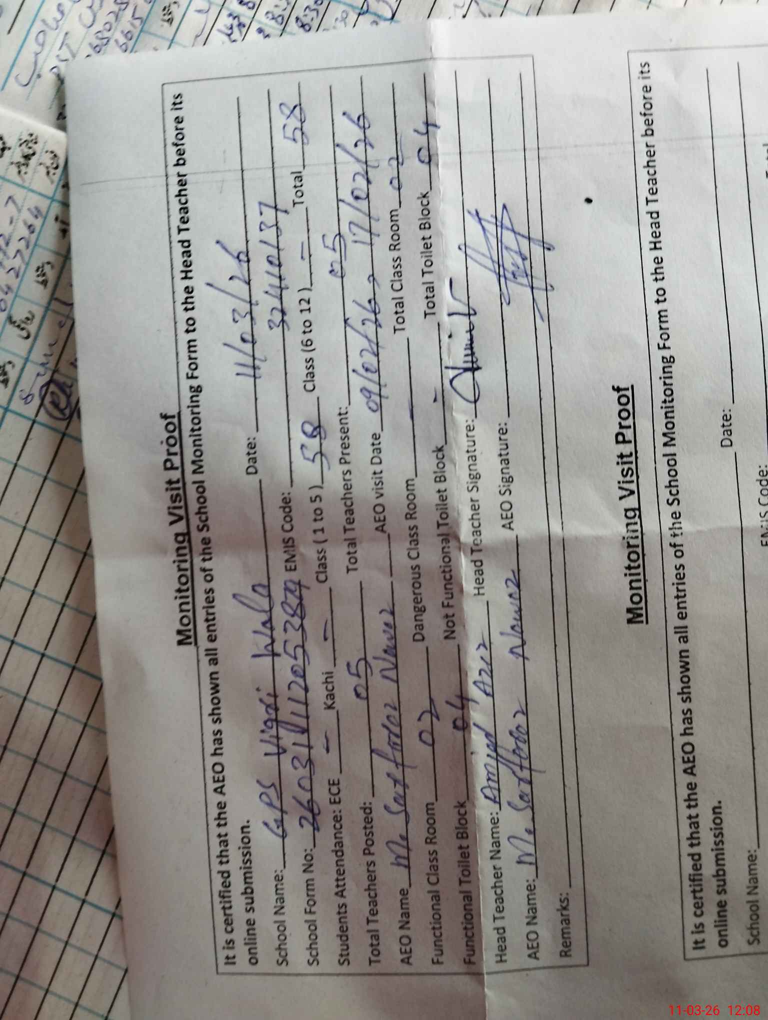 | Attendance Register | Head Teacher | MEA with School | Visit Proof |