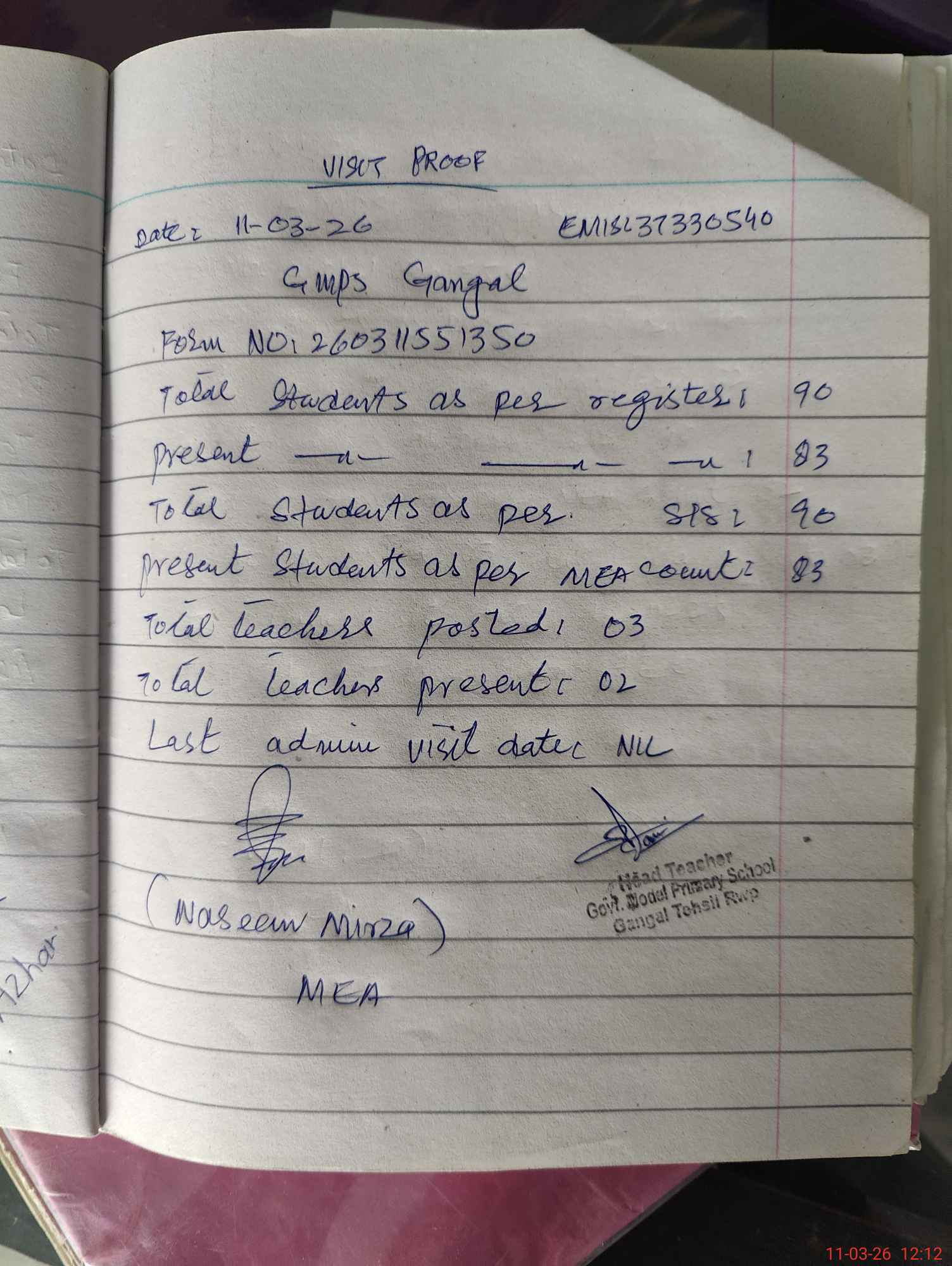 | Attendance Register | Head Teacher | MEA with School | Visit Proof |