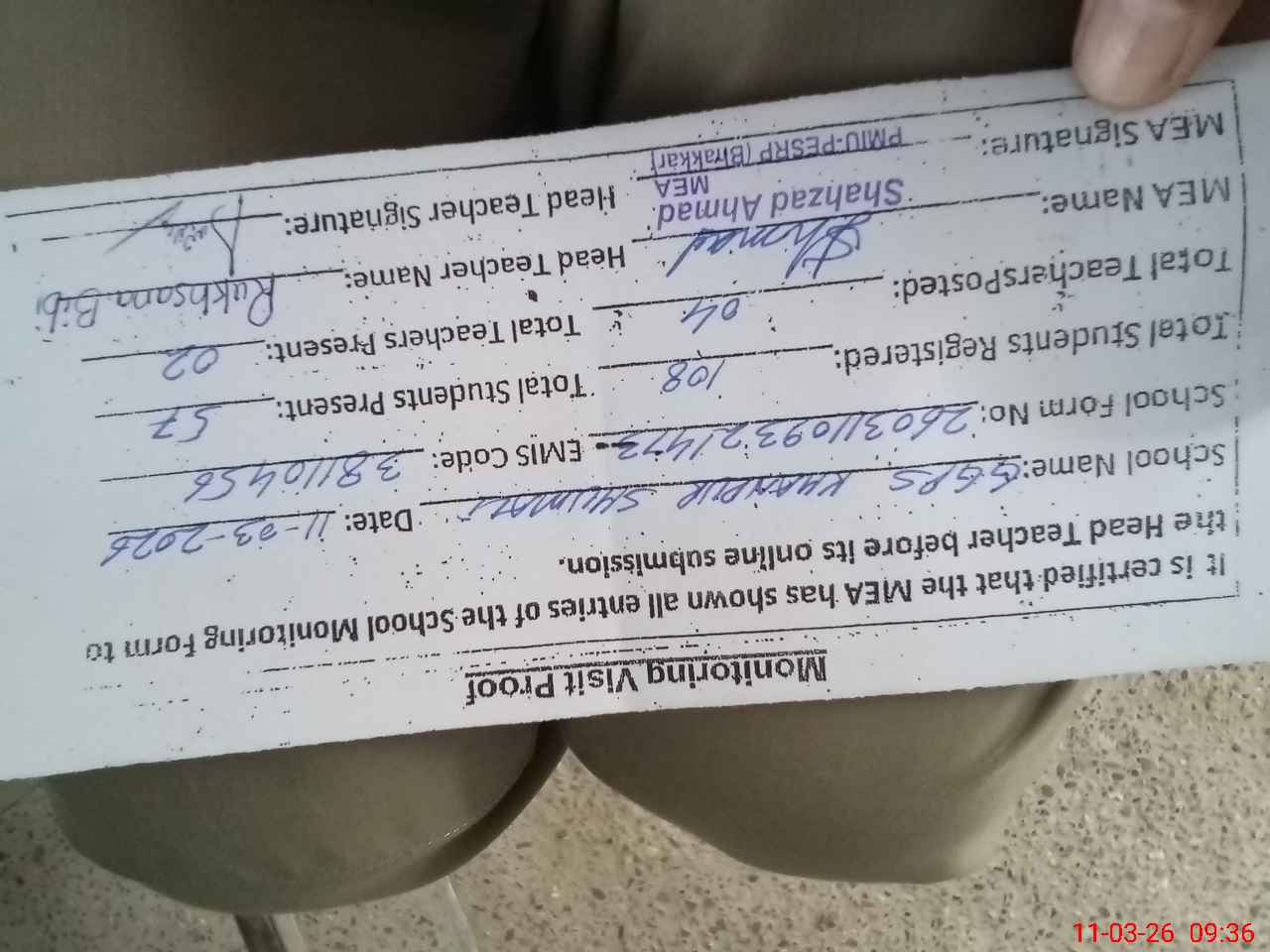 | Monitoring Date: 11-03-2026 | Start Time: 11-03-2026 09:16 AM | End Time: 11-03-2026 09:37 AM | Name of MEA: SH**** AH**** | |