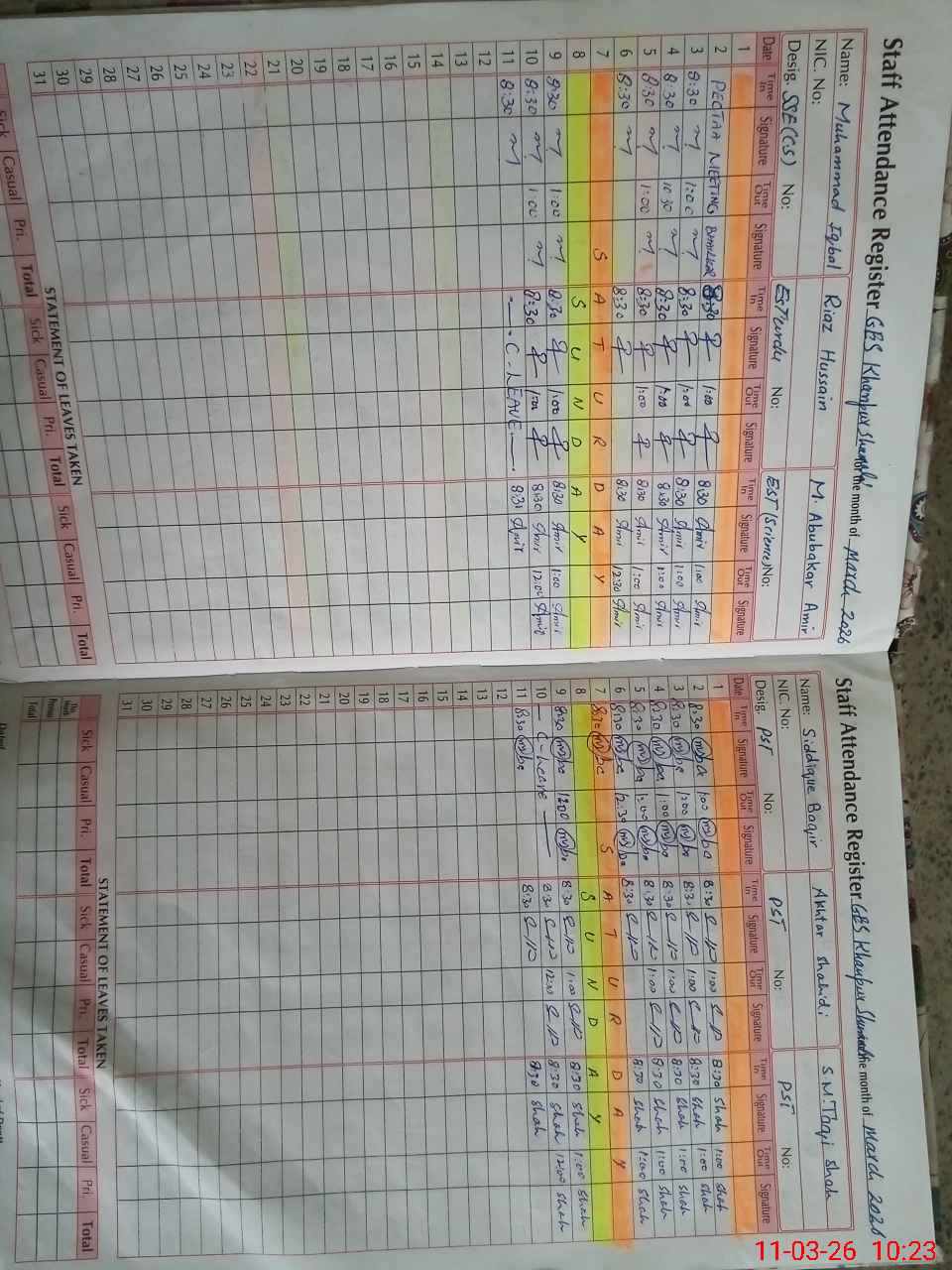 | CNIC | Full Name | Designation | R/C | Absence During Last Calender Month |