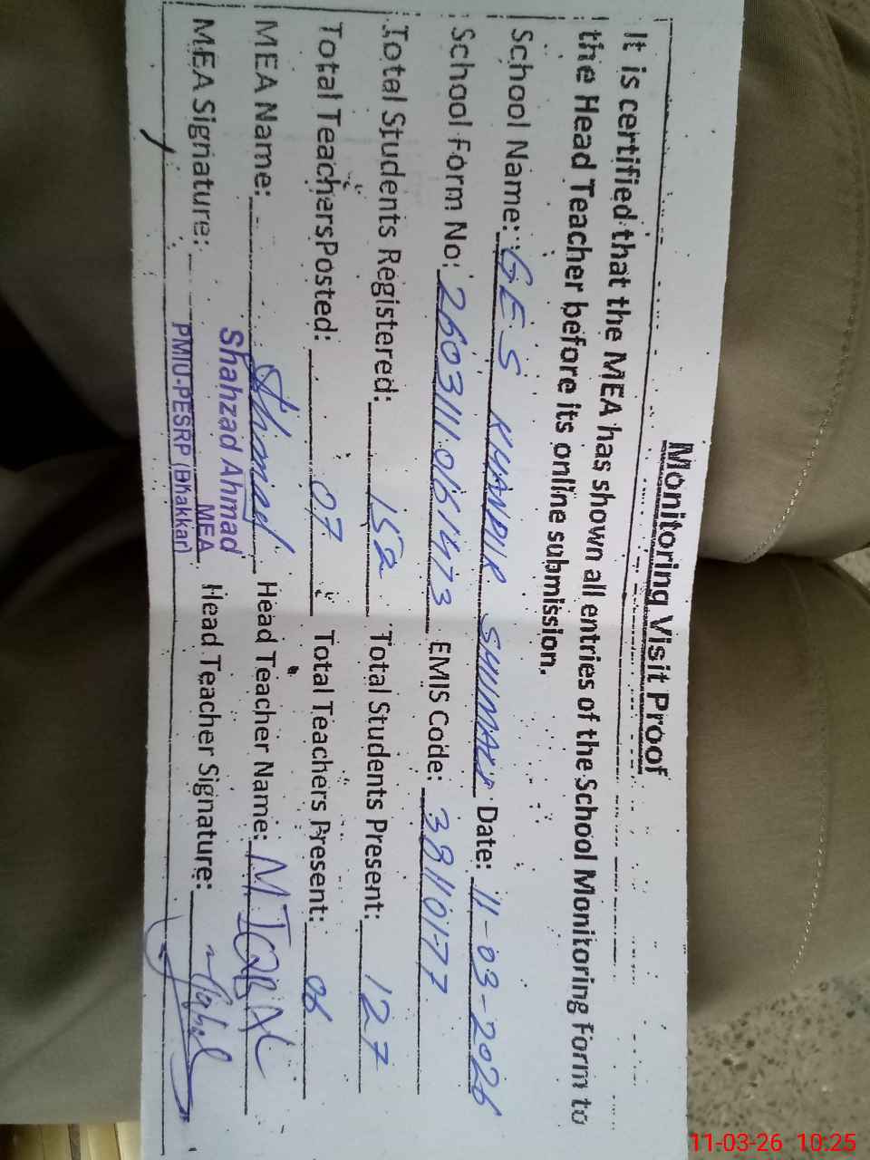 | Attendance Register | Head Teacher | MEA with School | Visit Proof |