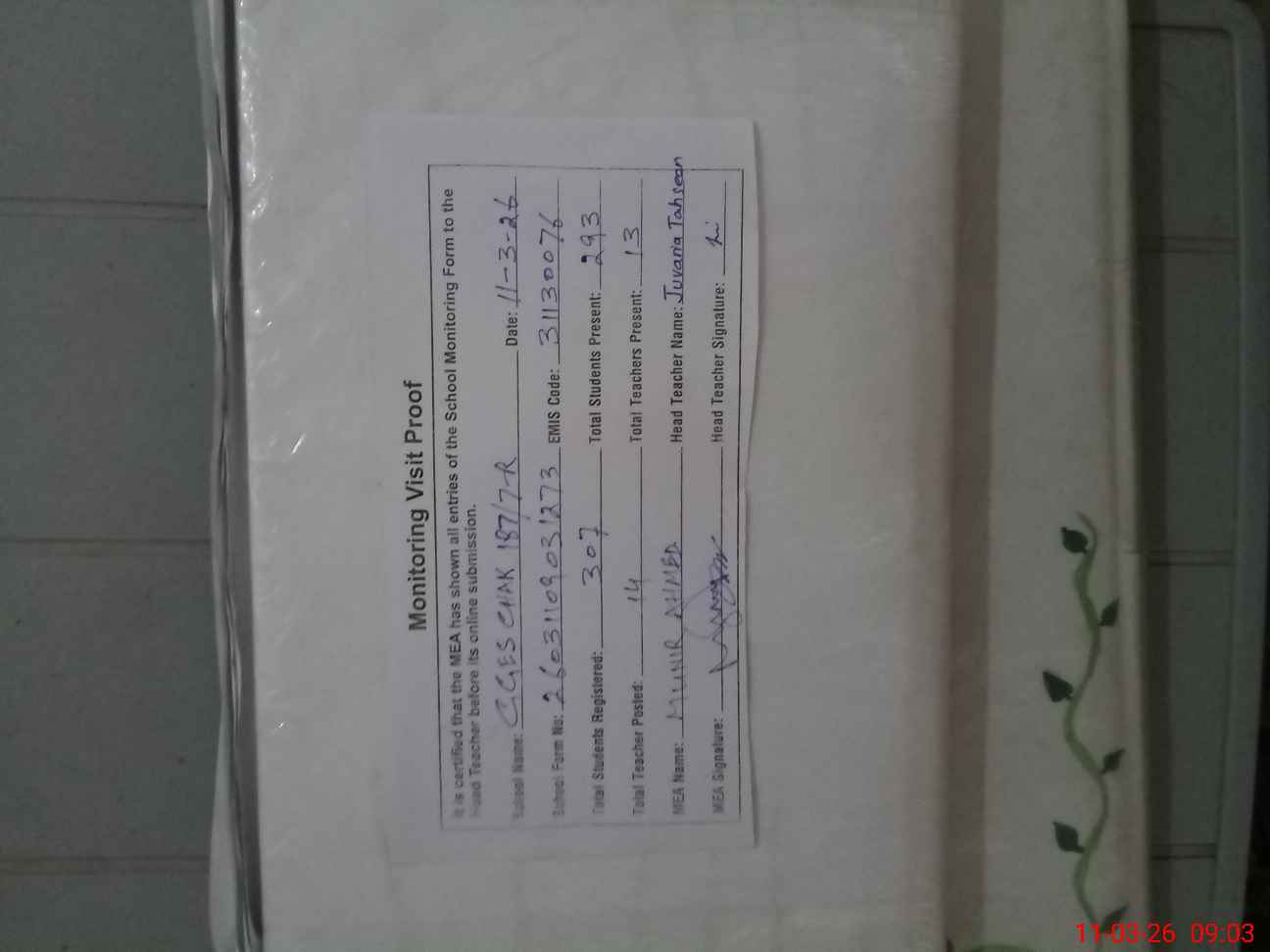 | Attendance Register | Head Teacher | MEA with School | Visit Proof |