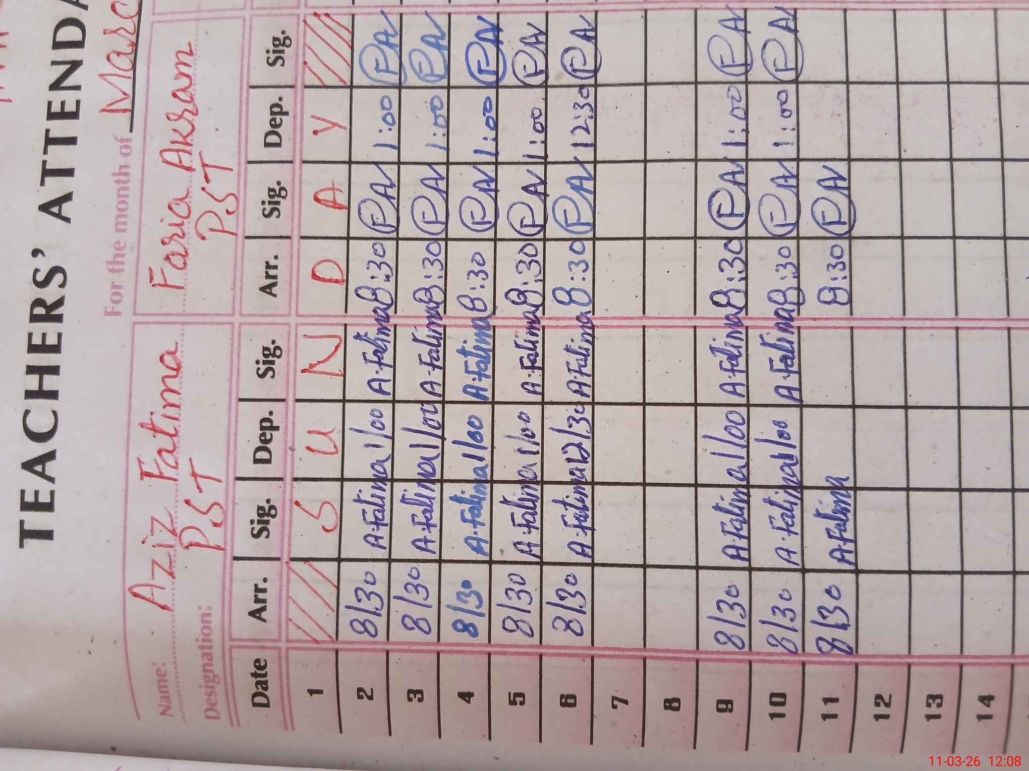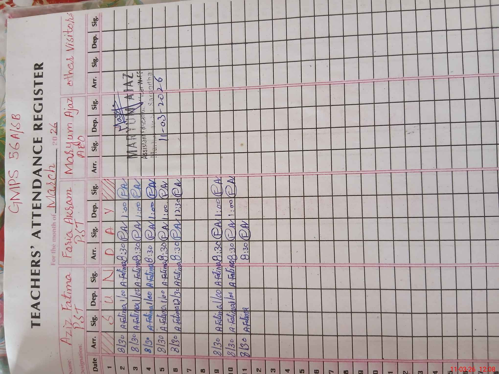 | Name: AZ**** FA**** Designation: (School Headmaster's/Headmistress's) PST Phone/Cell Number: 03**** |