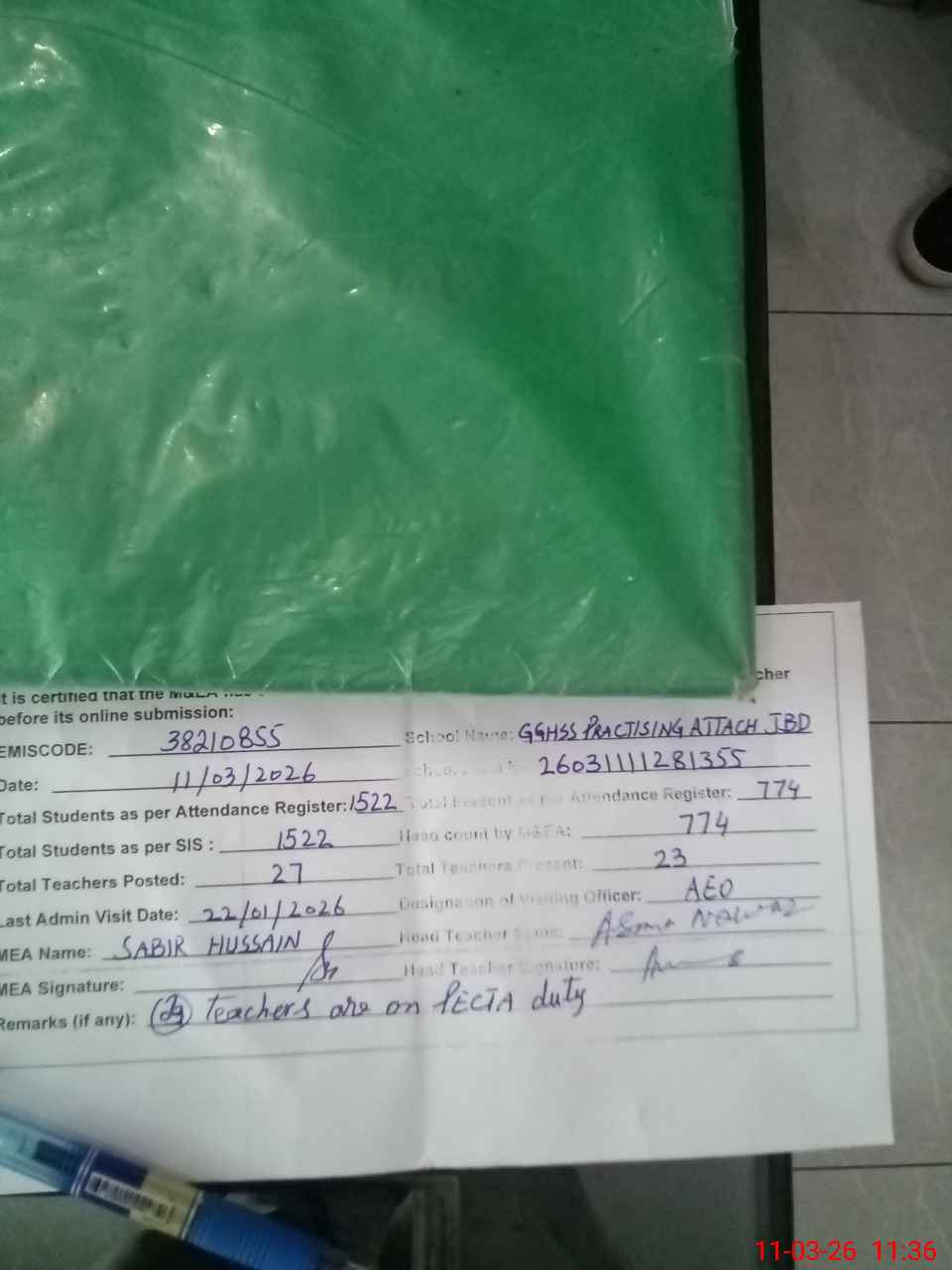 | Remarks (Use Separate Page if Required): no teacher absent total students on register 1522 total students on SiS 1522 last admin visit by AEO on 22 Jan 2026 | |||||