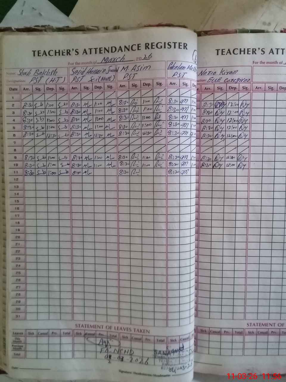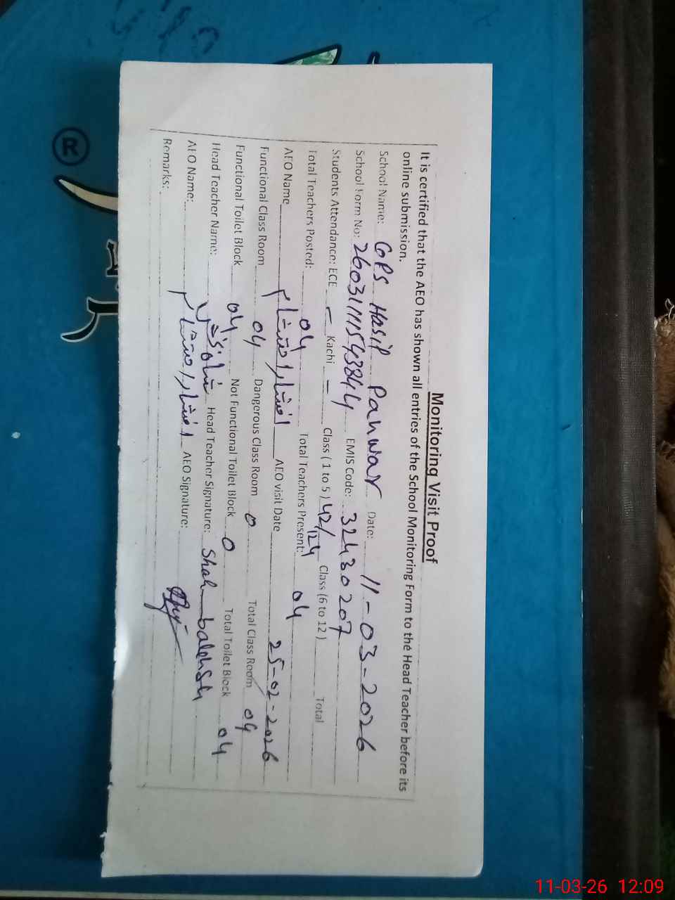 | Remarks (Use Separate Page if Required): According to govt notification ECCE , Kachi and One classes are on vacation till 31/03/2026 . | |||||