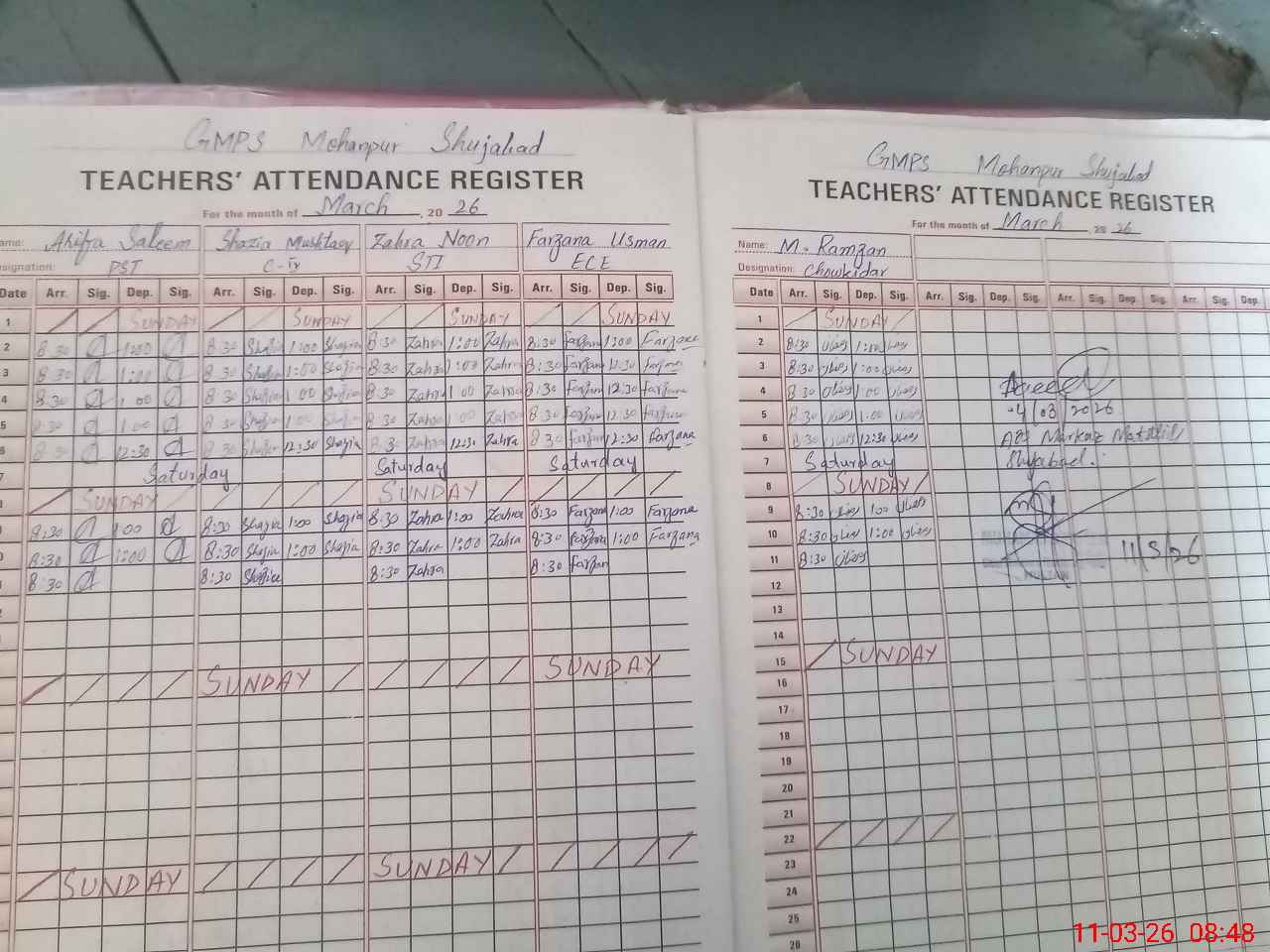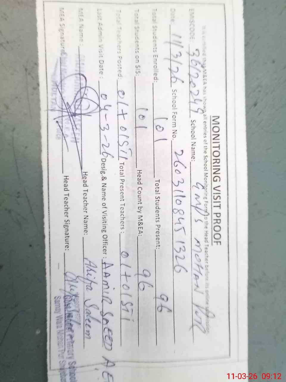 | Attendance Register | Head Teacher | MEA with School | Visit Proof |