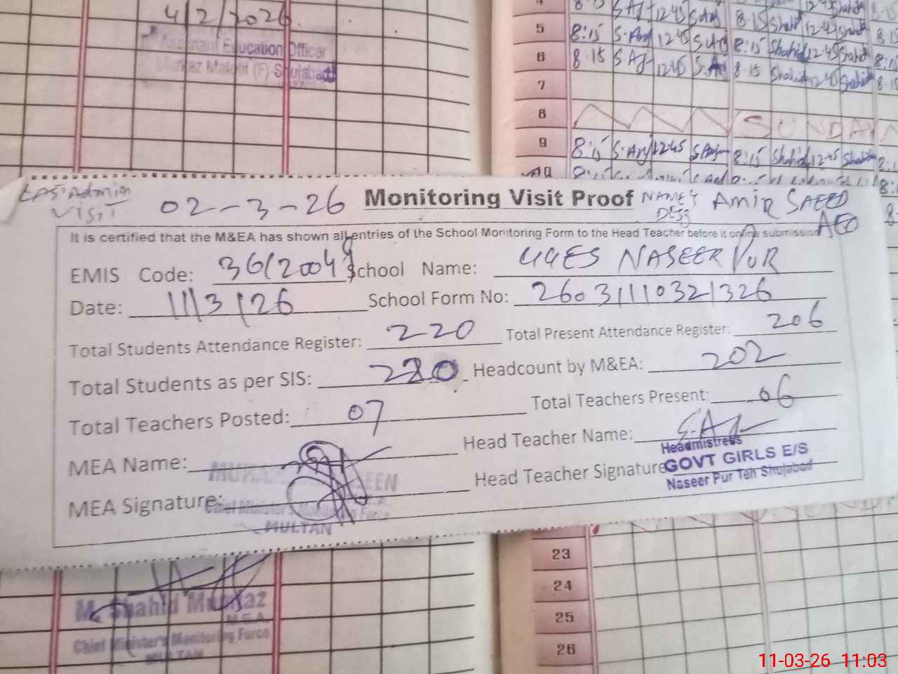 | Attendance Register | Head Teacher | MEA with School | Visit Proof |