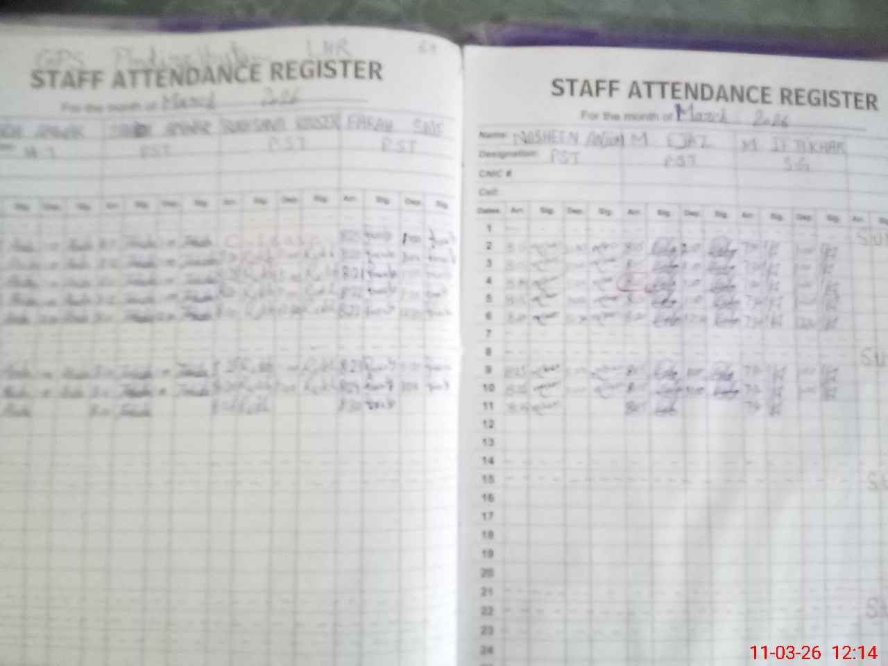 | CNIC | Full Name | Designation | R/C | Absence During Last Calender Month |
