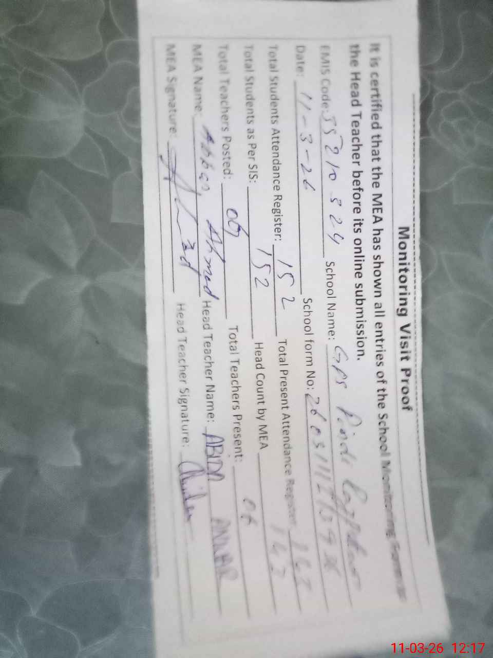 | Attendance Register | Head Teacher | MEA with School | Visit Proof |
