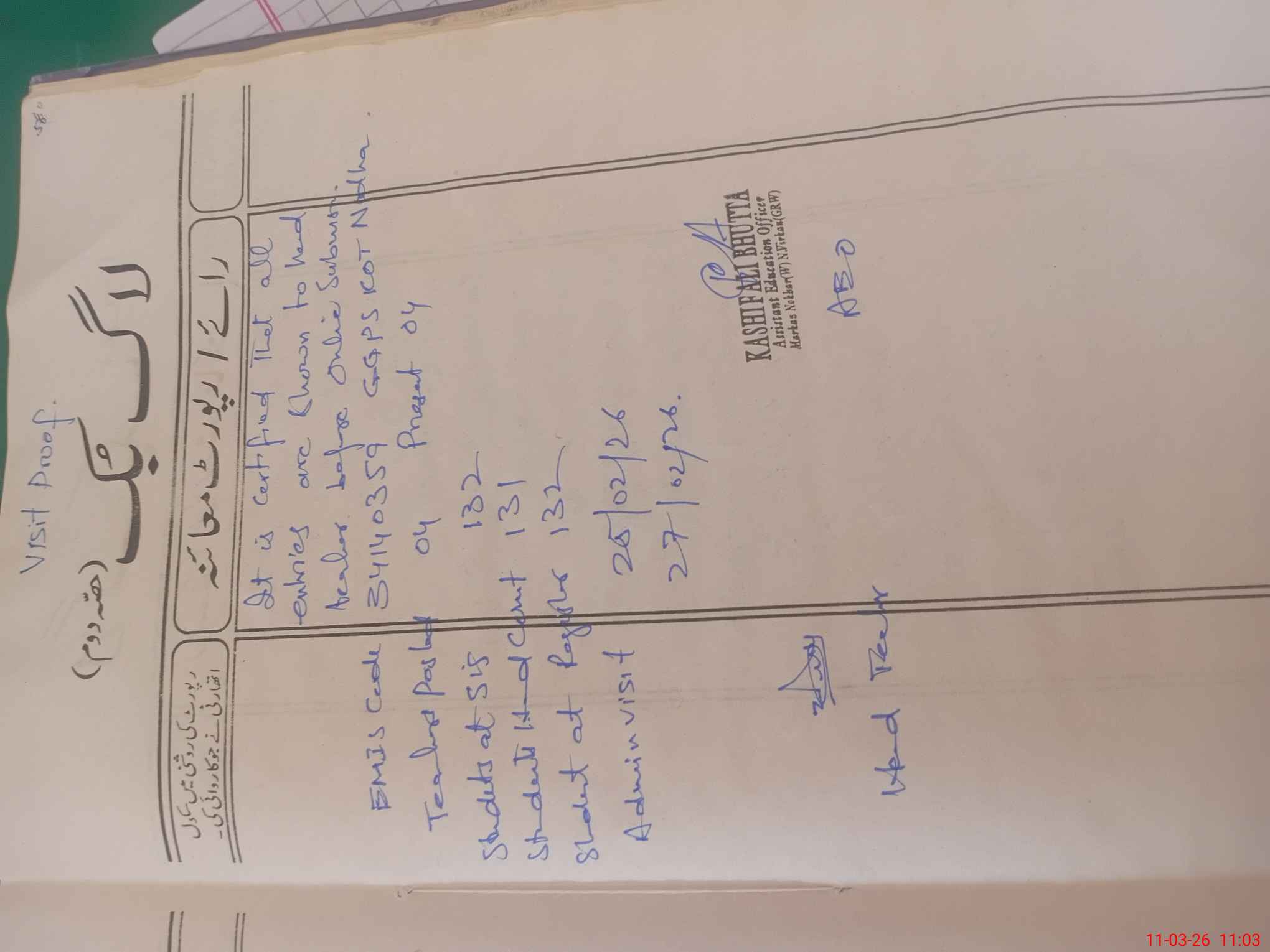 | Attendance Register | Head Teacher | MEA with School | Visit Proof |