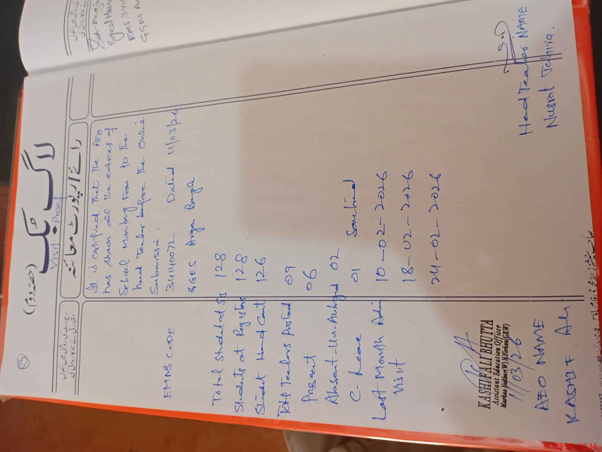 | Attendance Register | Head Teacher | MEA with School | Visit Proof |