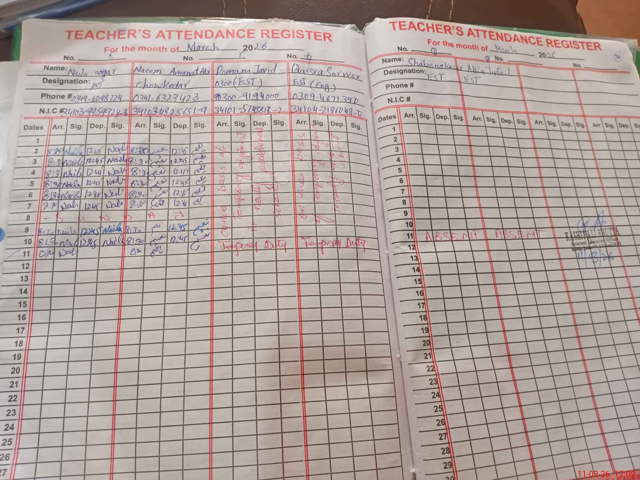 | CNIC | Full Name | Designation | R/C | Absence During Last Calender Month |