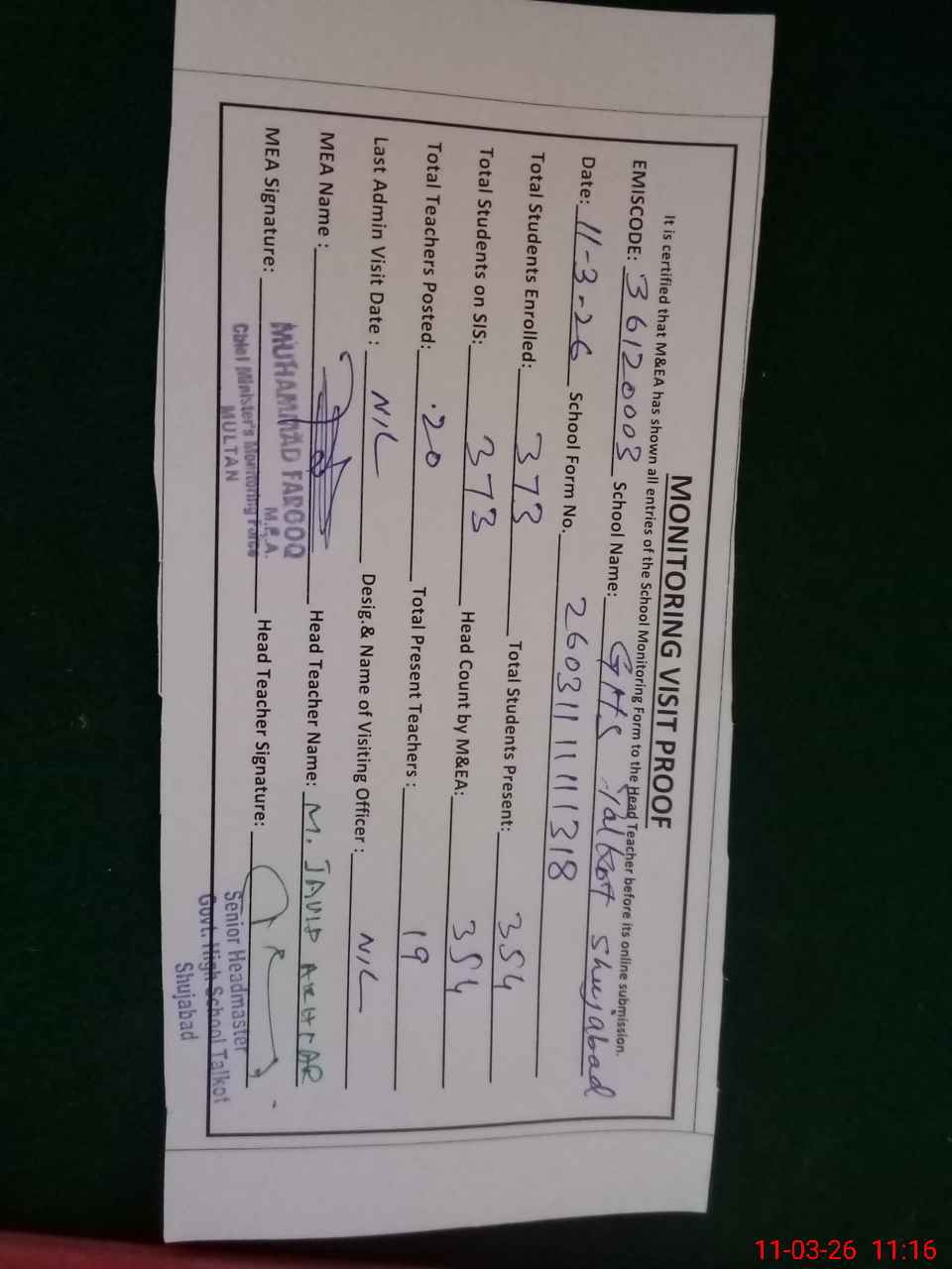 | EMIS Code: 36120003 | Name of School: GHS TALKOT SHUJA ABAD | |||
