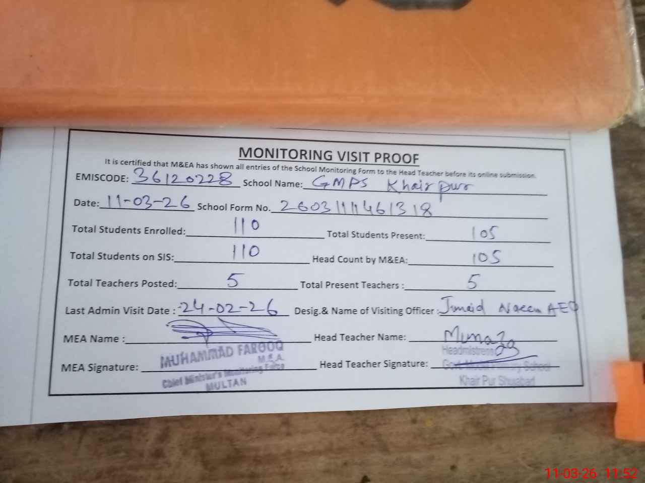 | EMIS Code: 36120228 | Name of School: GMPS KHAIR PUR SHUJABAD | |||