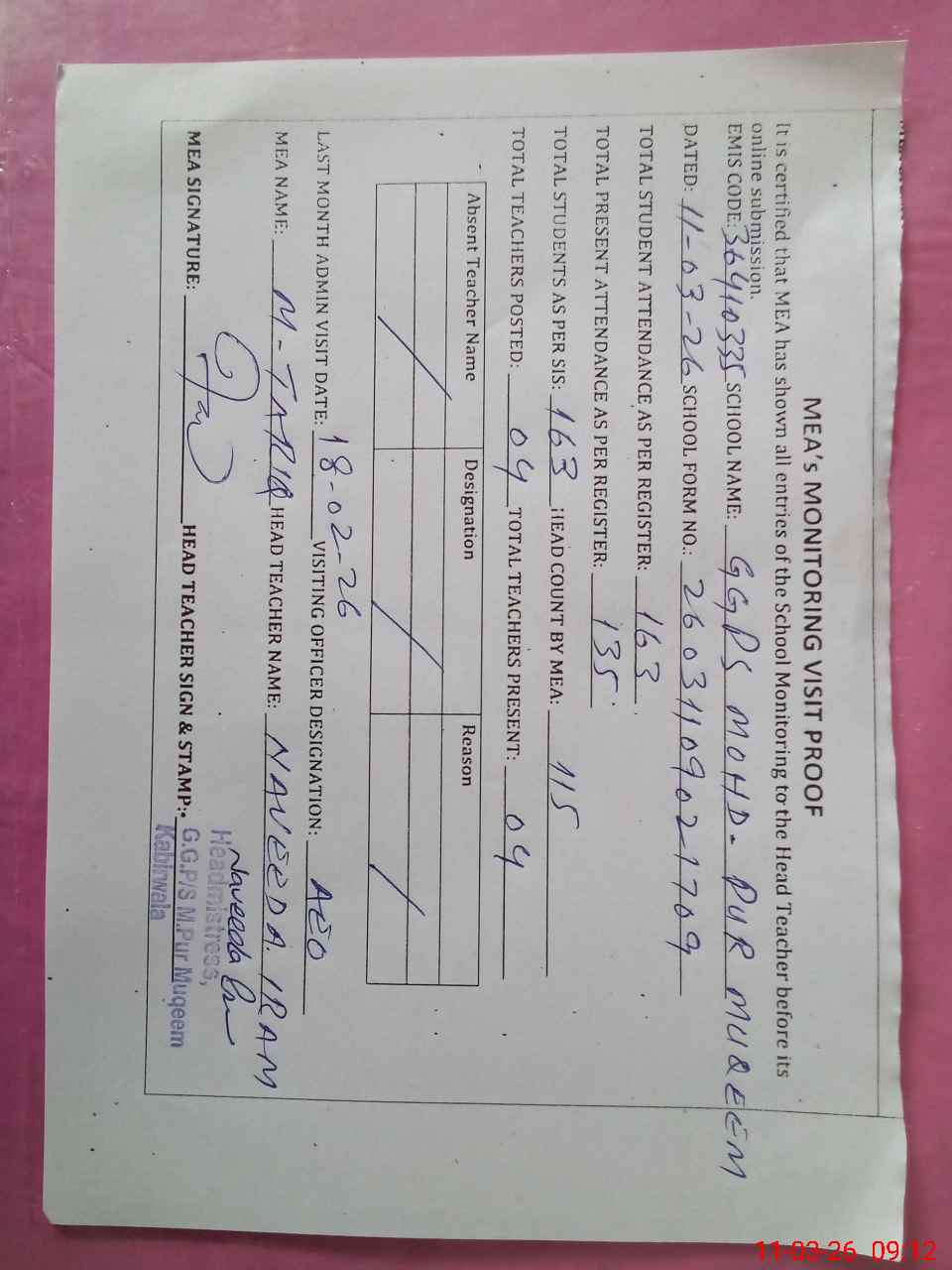 | Attendance Register | Head Teacher | MEA with School | Visit Proof |