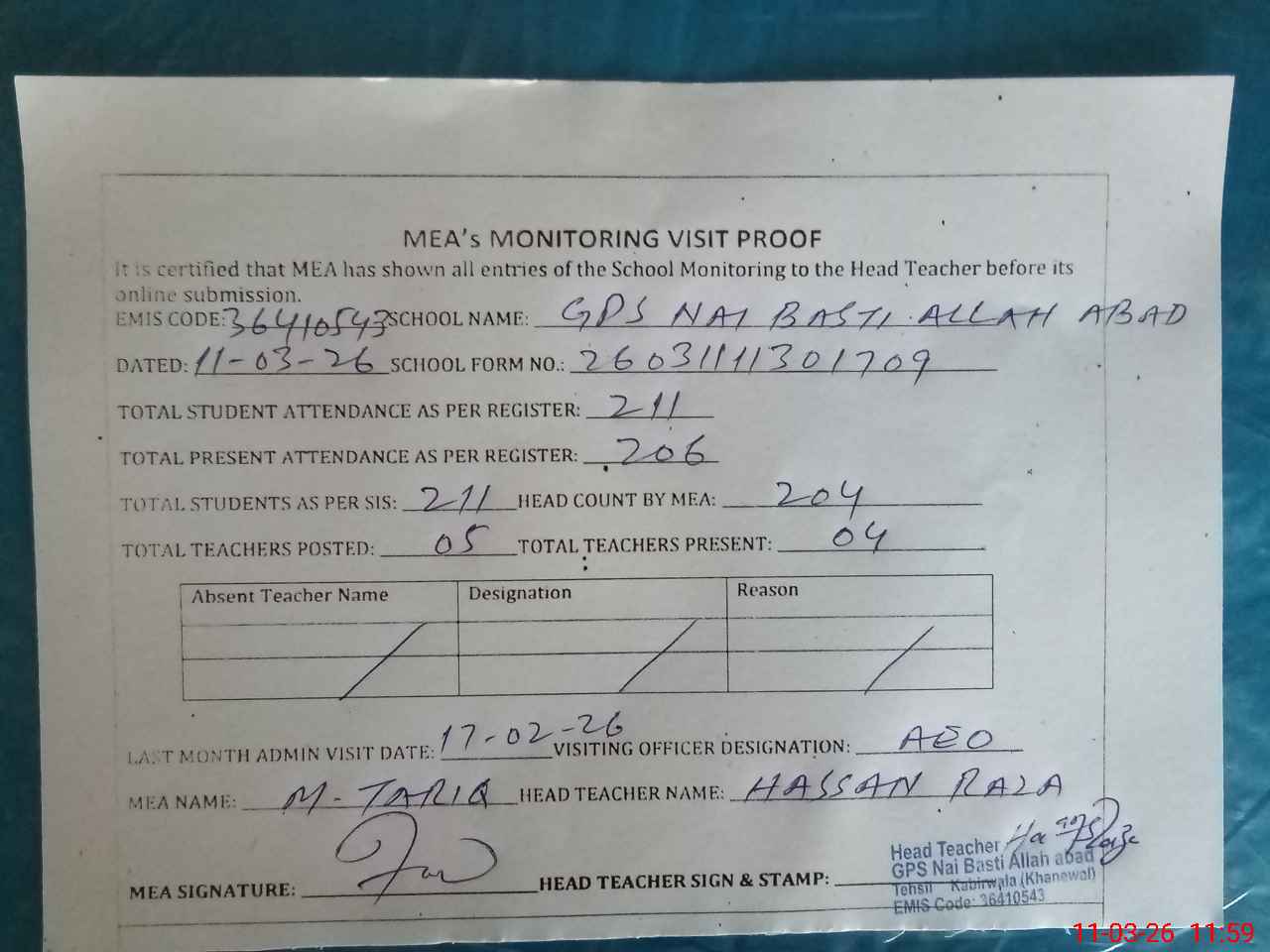 | EMIS Code: 36410543 | Name of School: GPS NAI BASTI ALLAH ABAD, KABIRWALA | |||