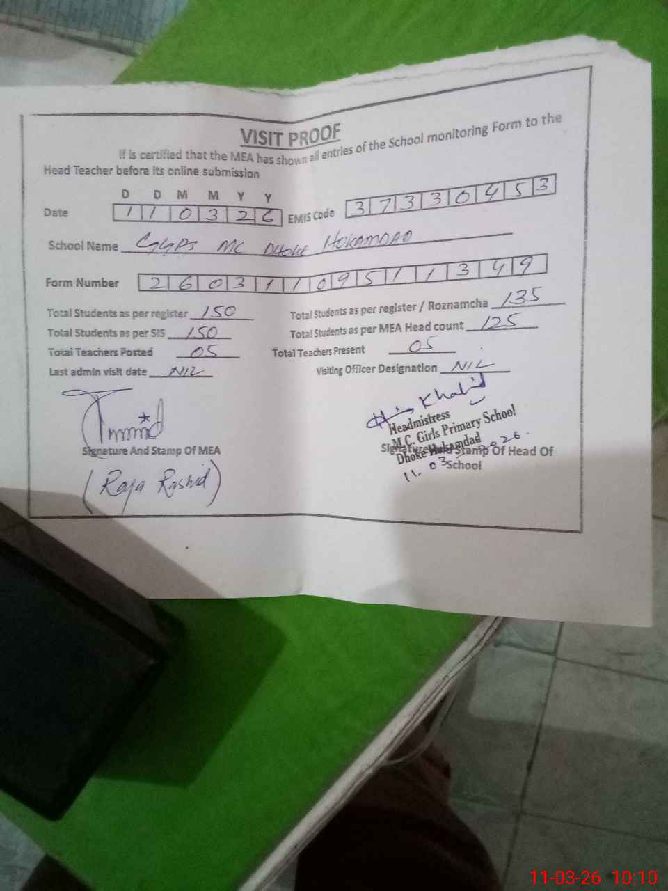 | Attendance Register | Head Teacher | MEA with School | Visit Proof |