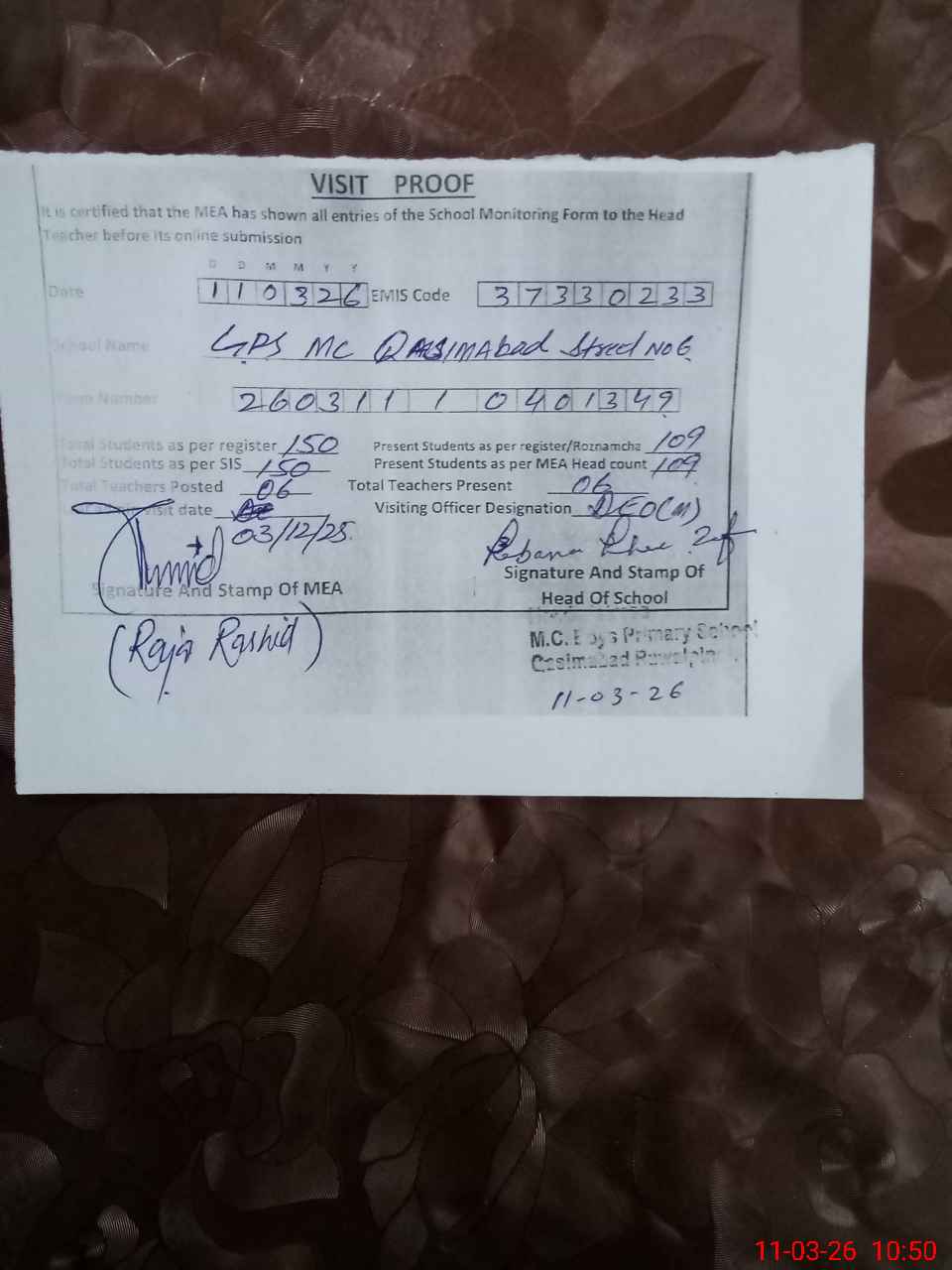 | EMIS Code: 37330233 | Name of School: GPS MC QASIMABAD STREET NO. 6 RWP | |||