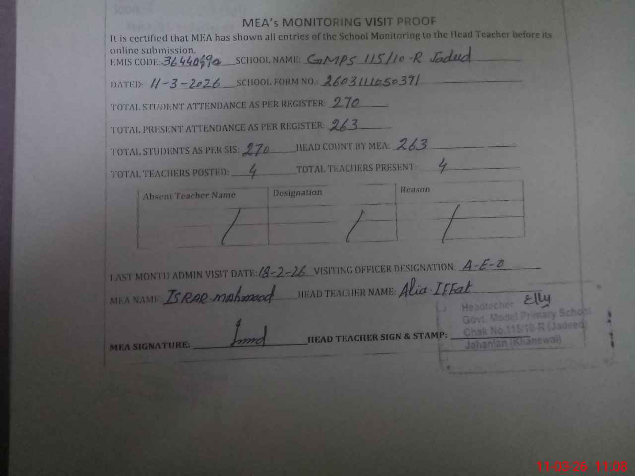 | Attendance Register | Head Teacher | MEA with School | Visit Proof |