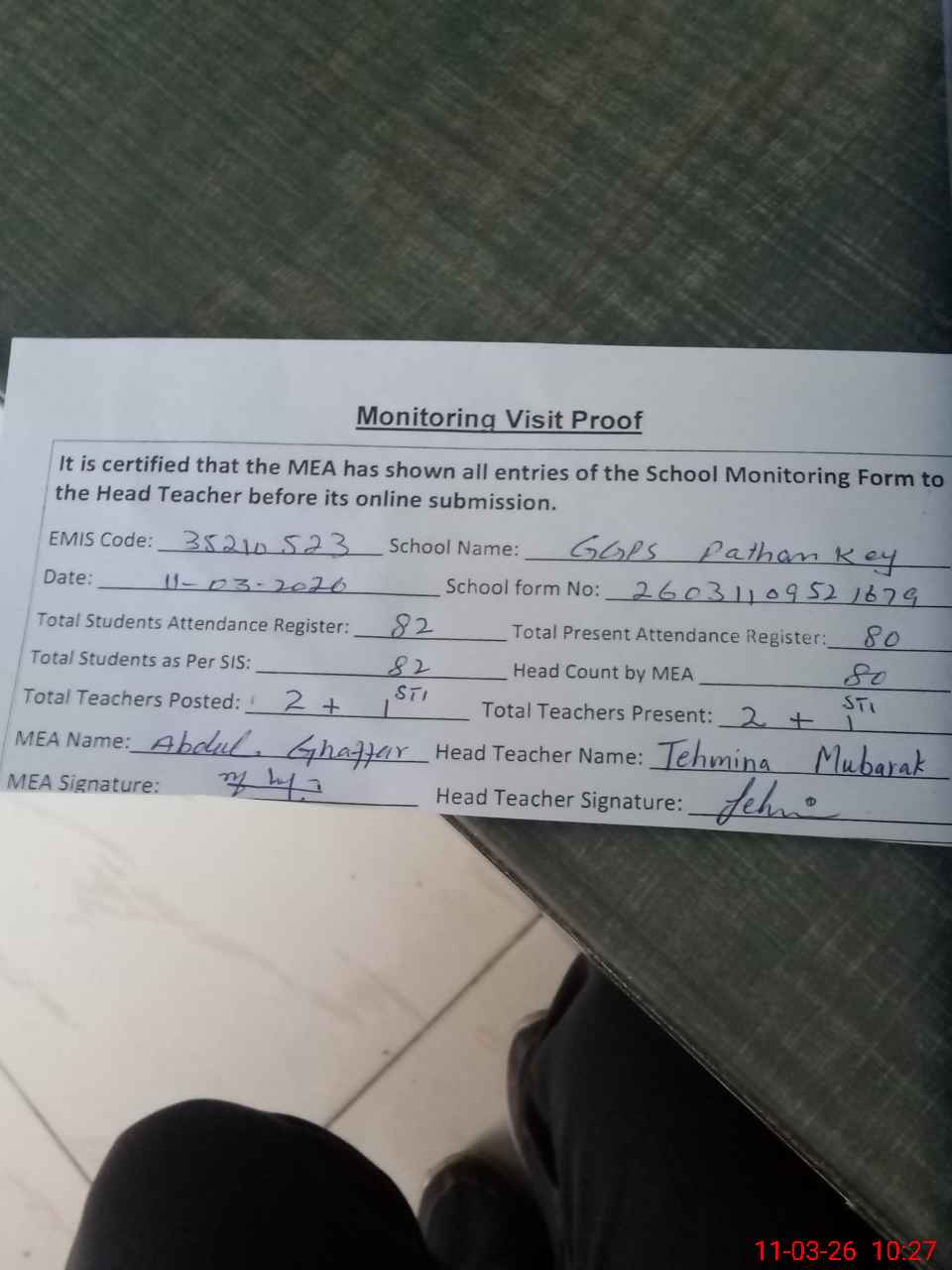 | Attendance Register | Head Teacher | MEA with School | Visit Proof |