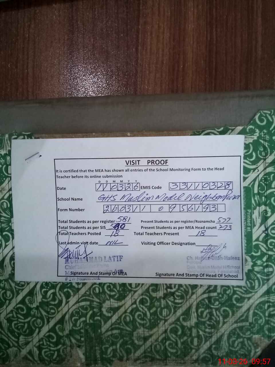 | Attendance Register | Head Teacher | MEA with School | Visit Proof |