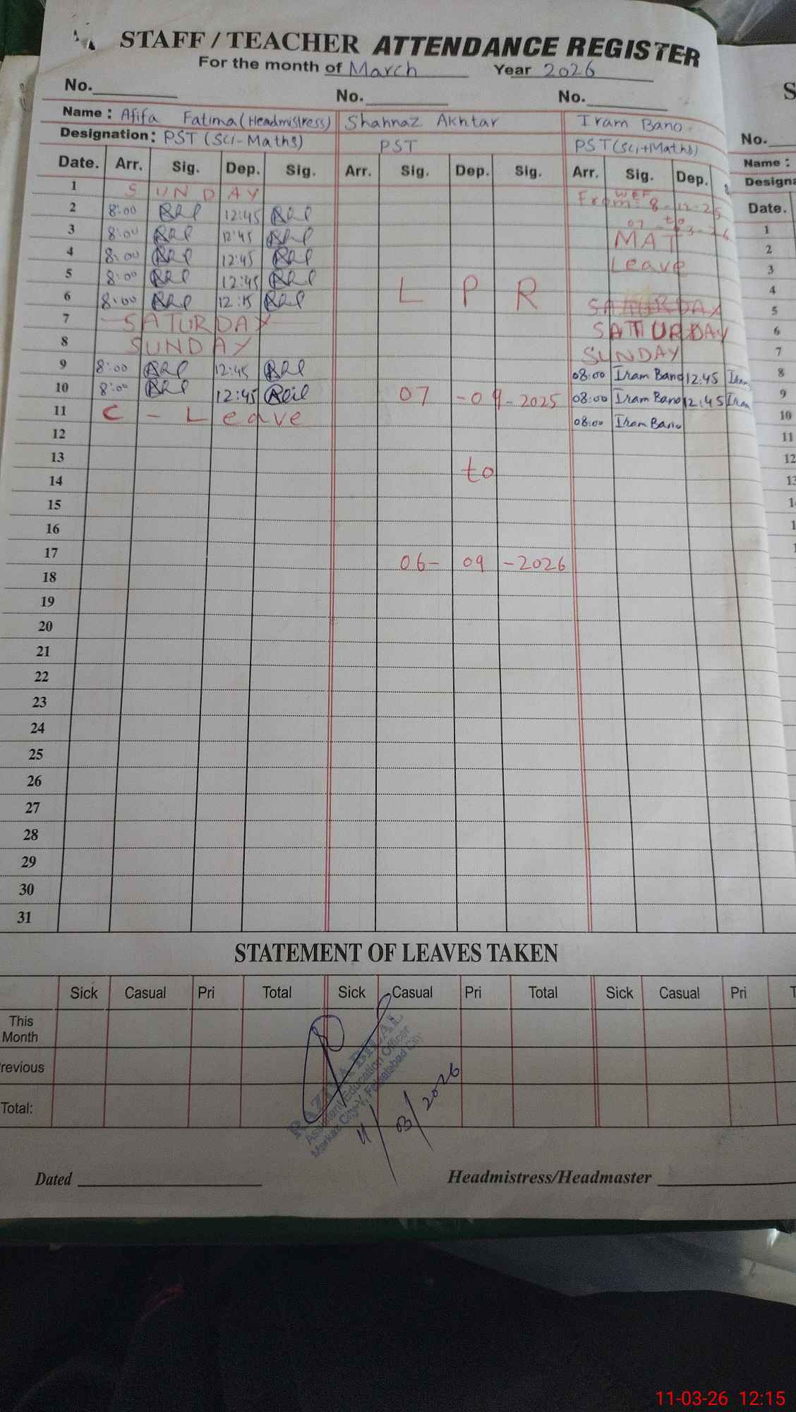 | Leave | Duty | Absent | Maternity | Medical | Ex- Pak |