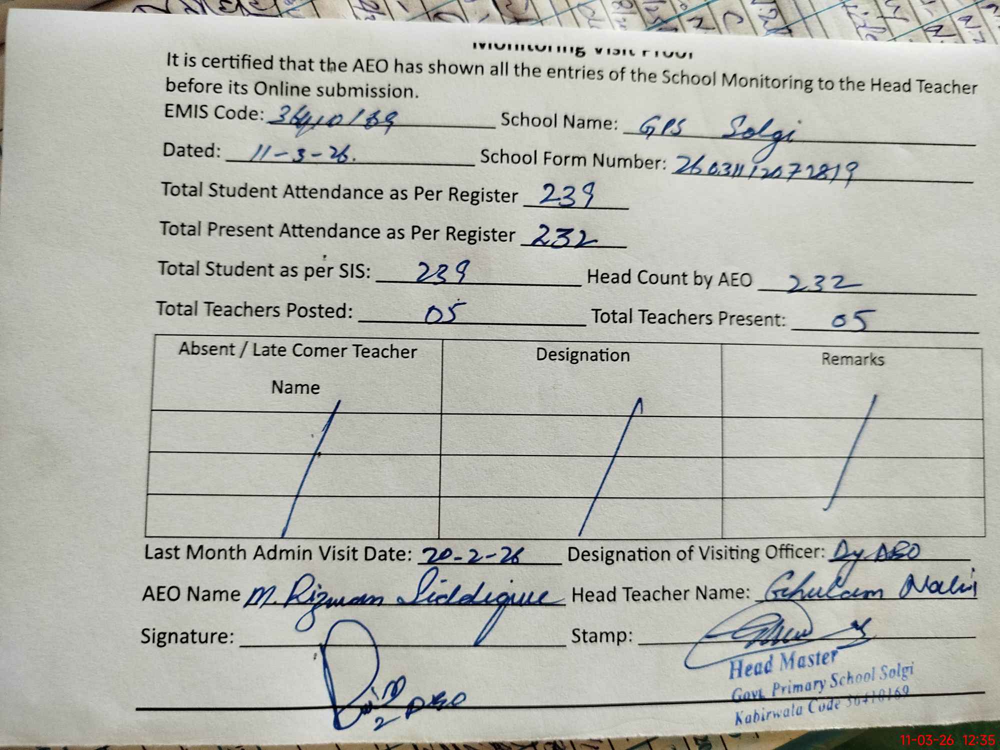 | EMIS Code: 36410169 | Name of School: GPS SOLGI, P/O JAWIND SING WALA, KABIRWALA | |||