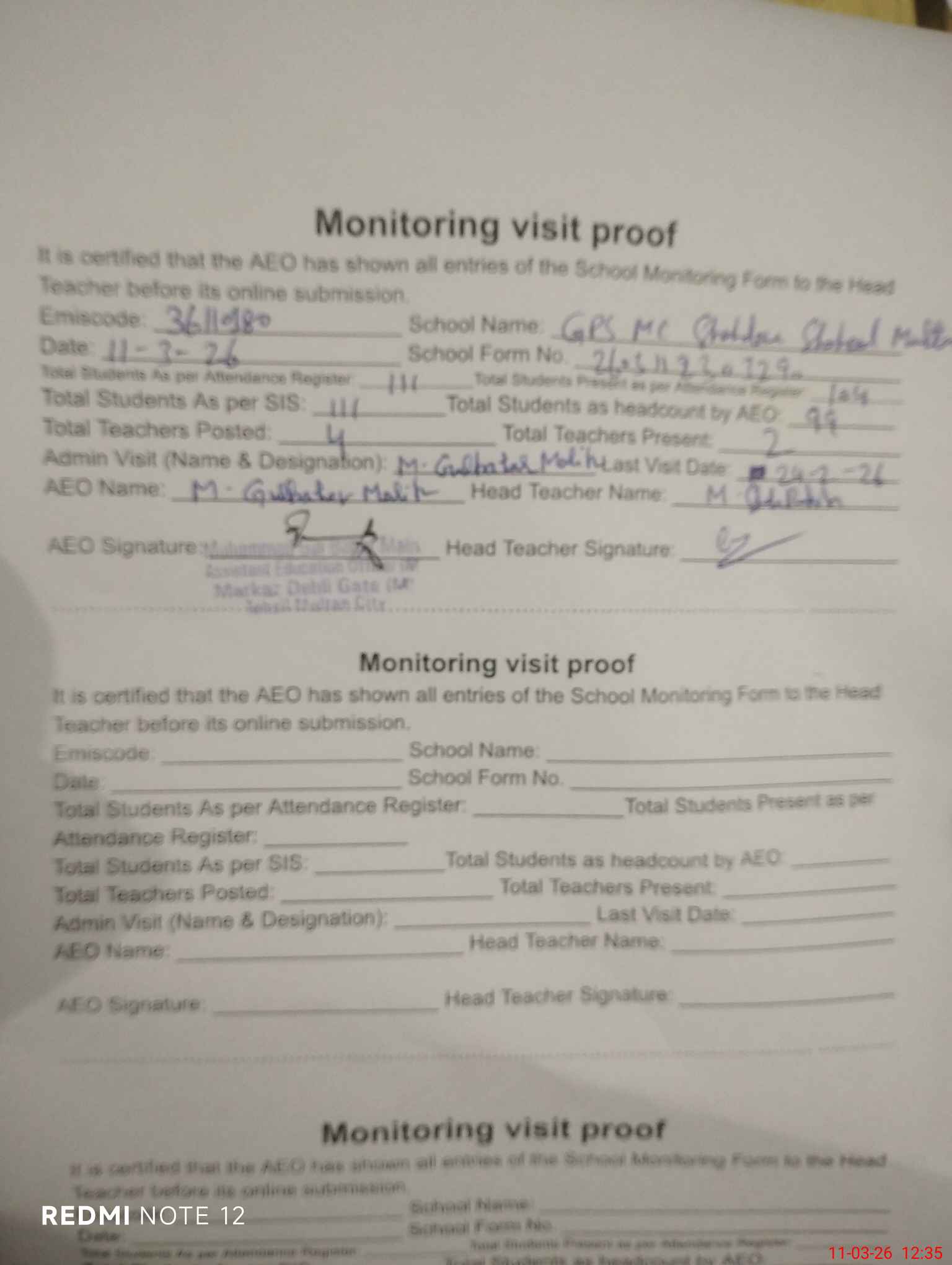 | Monitoring Date: 11-03-2026 | Start Time: 11-03-2026 12:18 PM | End Time: 11-03-2026 12:35 PM | Name of MEA: Mu**** Gu**** Ba**** Ma**** | |