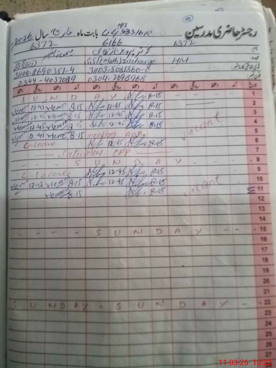 | 31**** | Ma**** As**** | PST Science/Maths | Regular | 5 | 0 | 0 | 0 | 0 | 0 | 0 | 0 | 5 | Exam Duty |