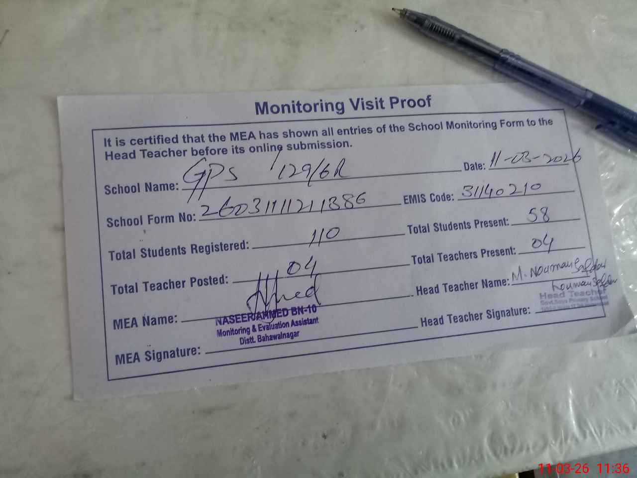 | EMIS Code: 31140210 | Name of School: GPS CHAK NO 129/6-R | |||