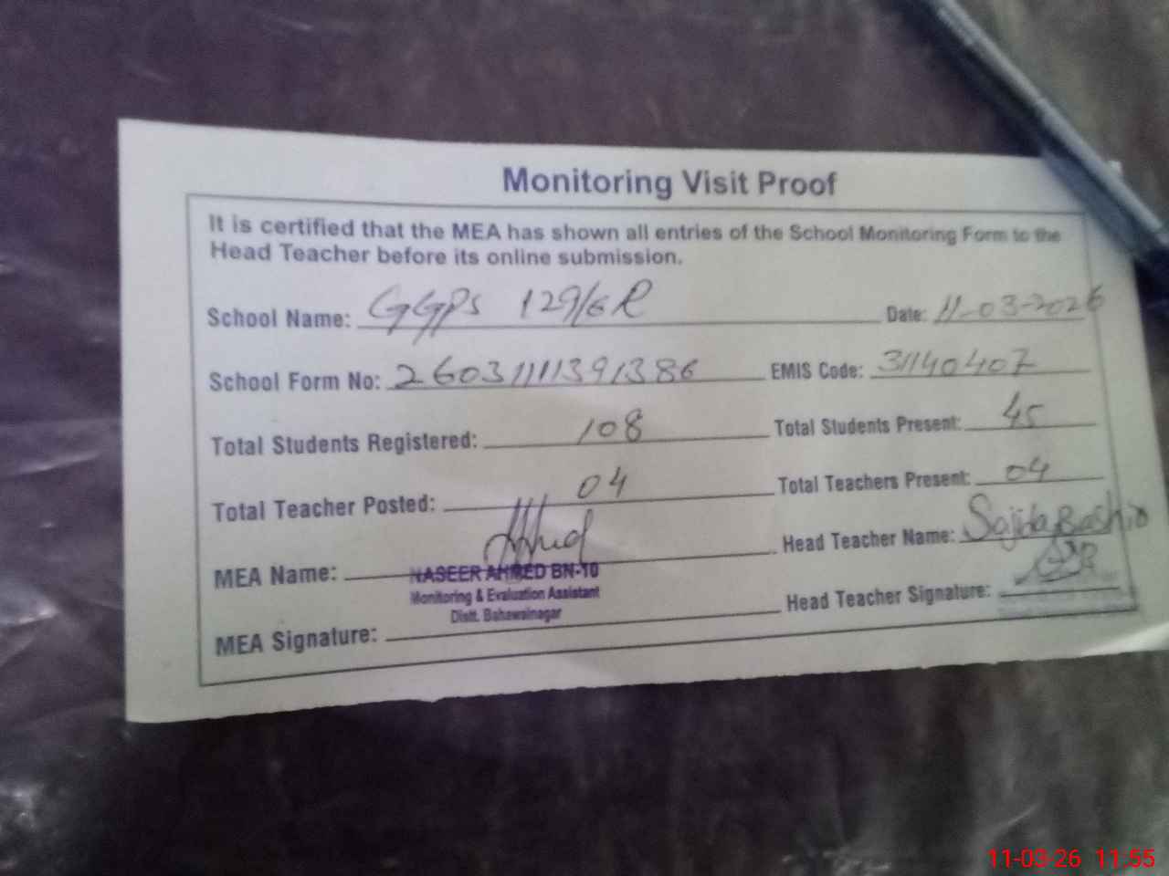 | EMIS Code: 31140407 | Name of School: GGPS CHAK NO 129/6-R | |||