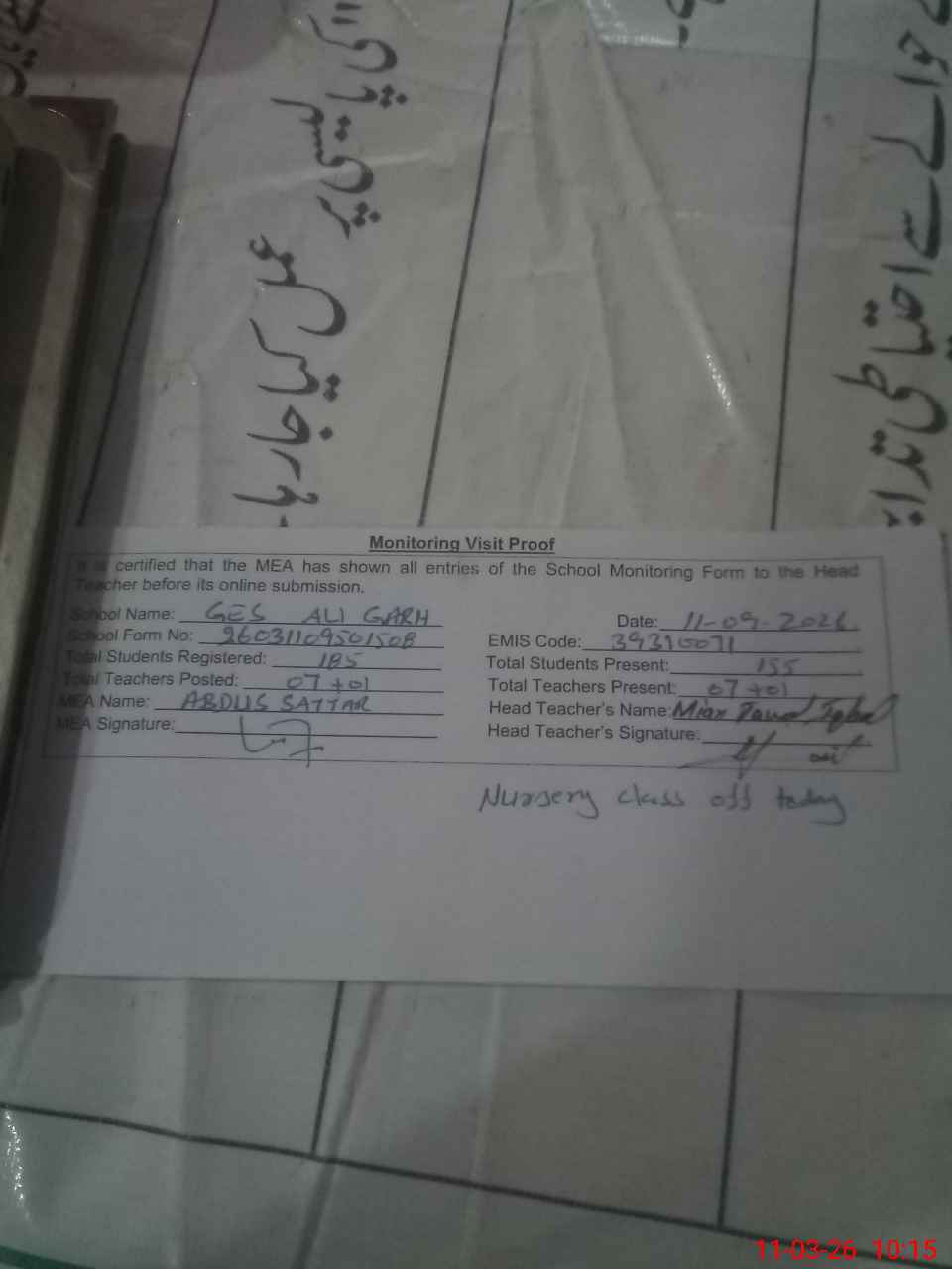 | Attendance Register | Head Teacher | MEA with School | Visit Proof |