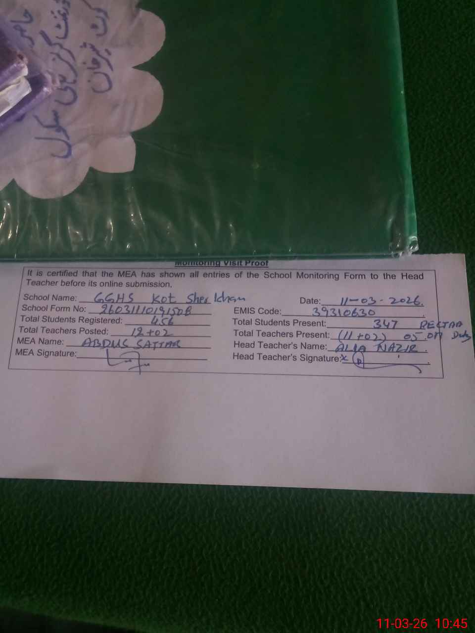 | Attendance Register | Head Teacher | MEA with School | Visit Proof |