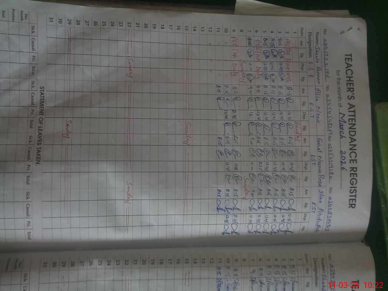 | 35**** | Sh**** Ja**** | PST | Regular | 0 | 0 | 0 | 0 | 0 | 0 | 0 | 0 | 0 | Exam Duty |