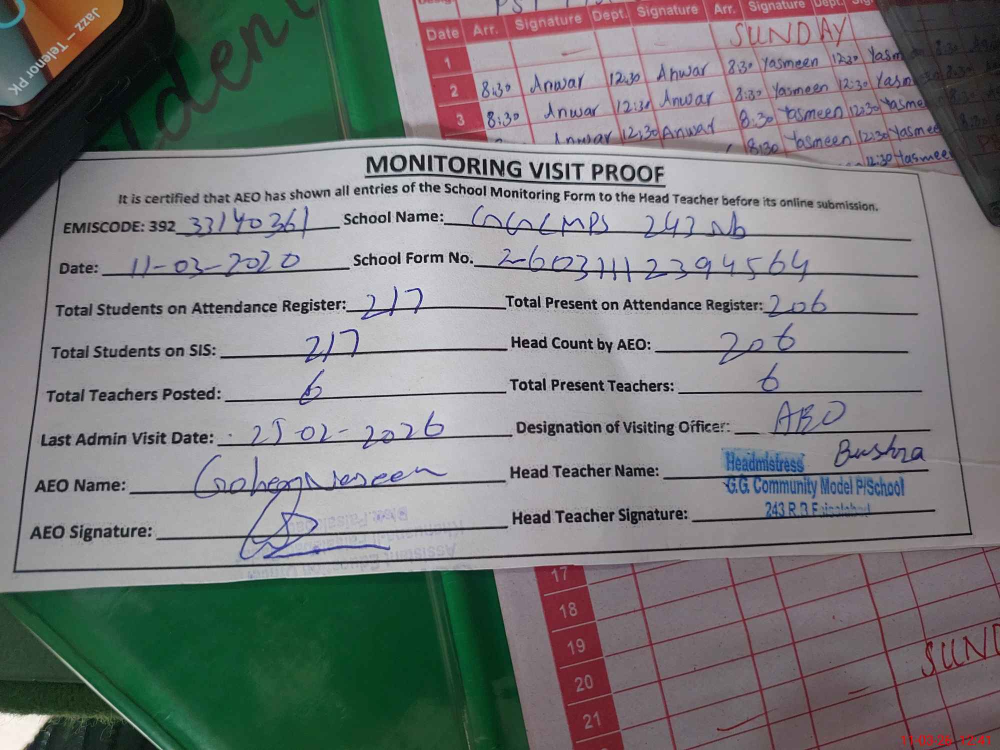 | Attendance Register | Head Teacher | MEA with School | Visit Proof |